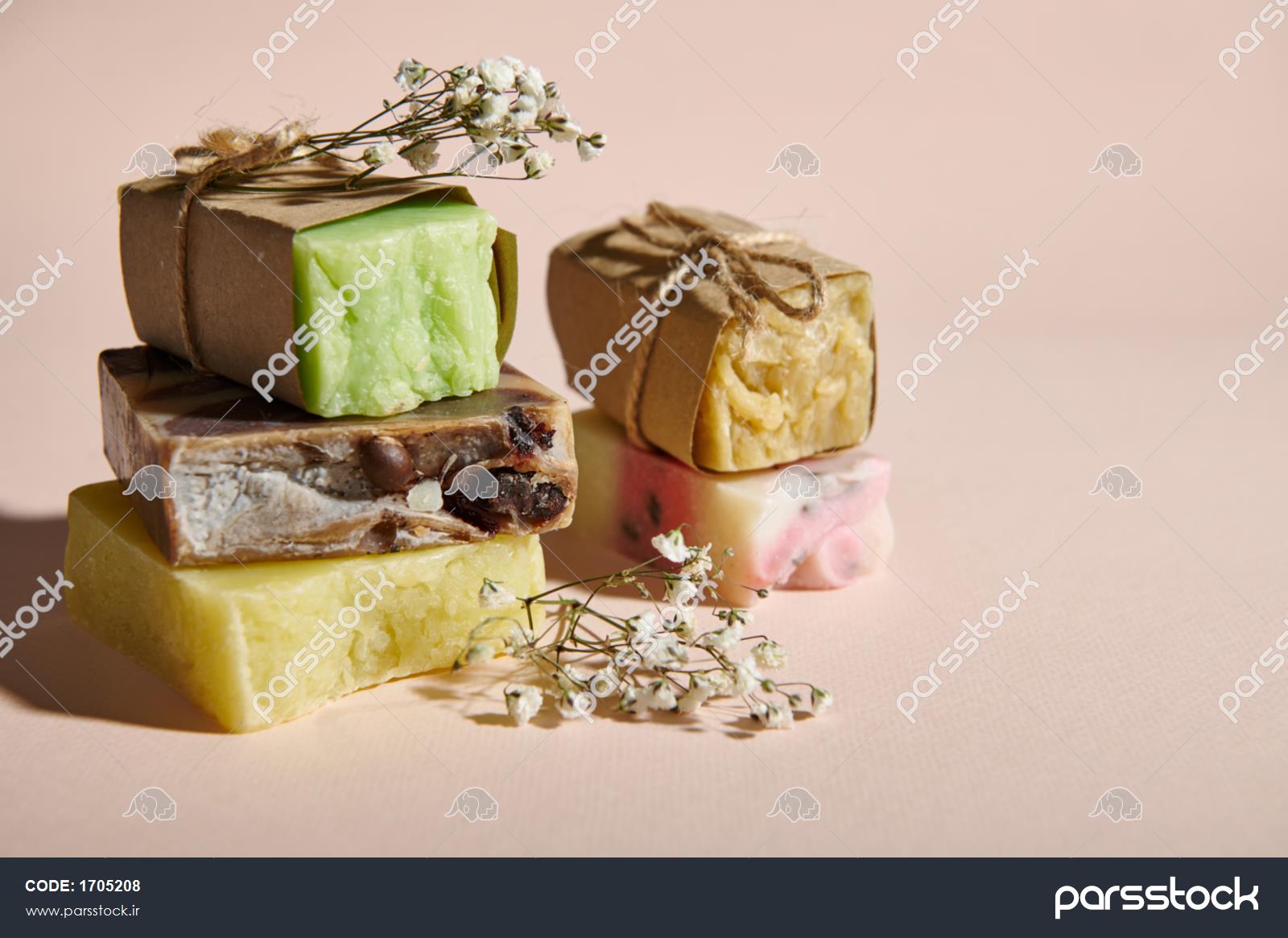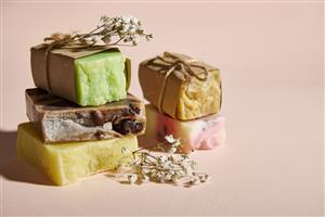 طبیعت بی جان میلههای صابون ارگانیک پیچیدهشده در کاغذ اکو و گلهای گچسوفیلا روی پسزمینه بژ جدا شده مفهوم محصولات آرایشی اکولوژیکی طبیعی برای مراقبت از پوست بدن با مواد طبیعی