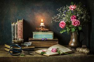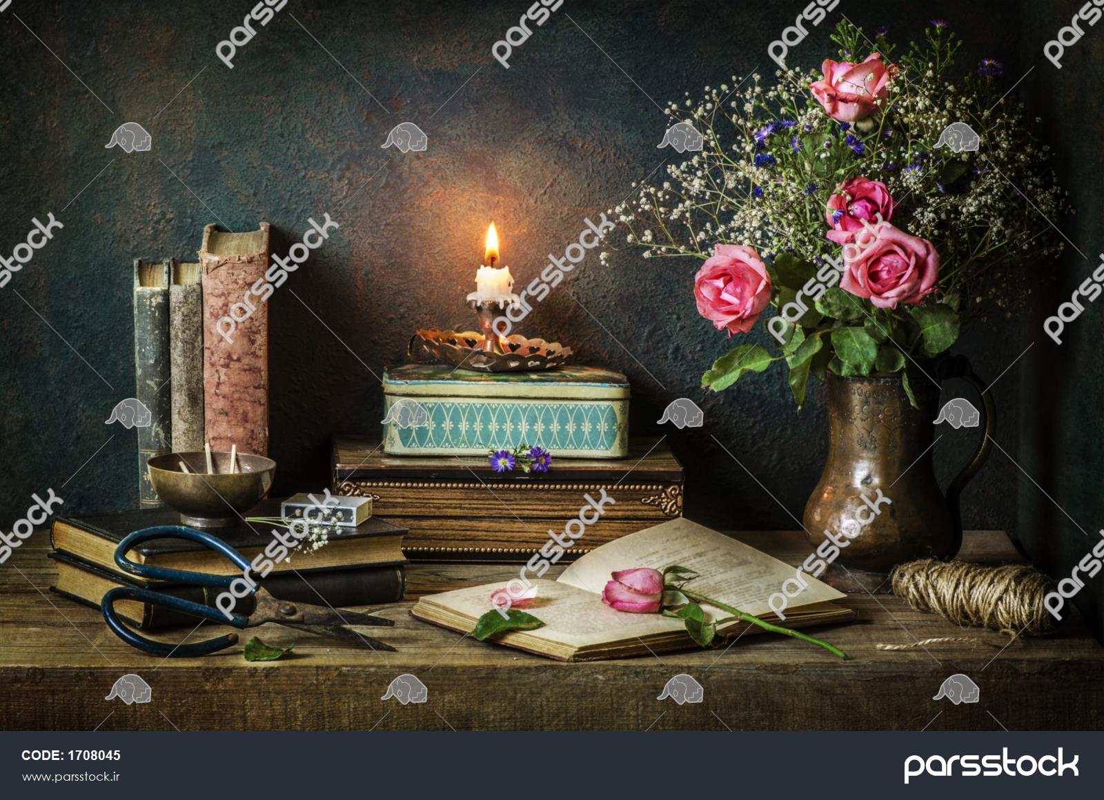 طبیعت بی جان کلاسیک با کتاب های قدیمی با گل های رز صورتی زیبا جعبه های قدیمی قیچی شمع نورانی نخ کرفس روی زمینه چوبی روستایی قرار داده شده است