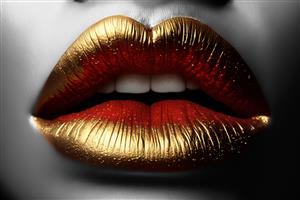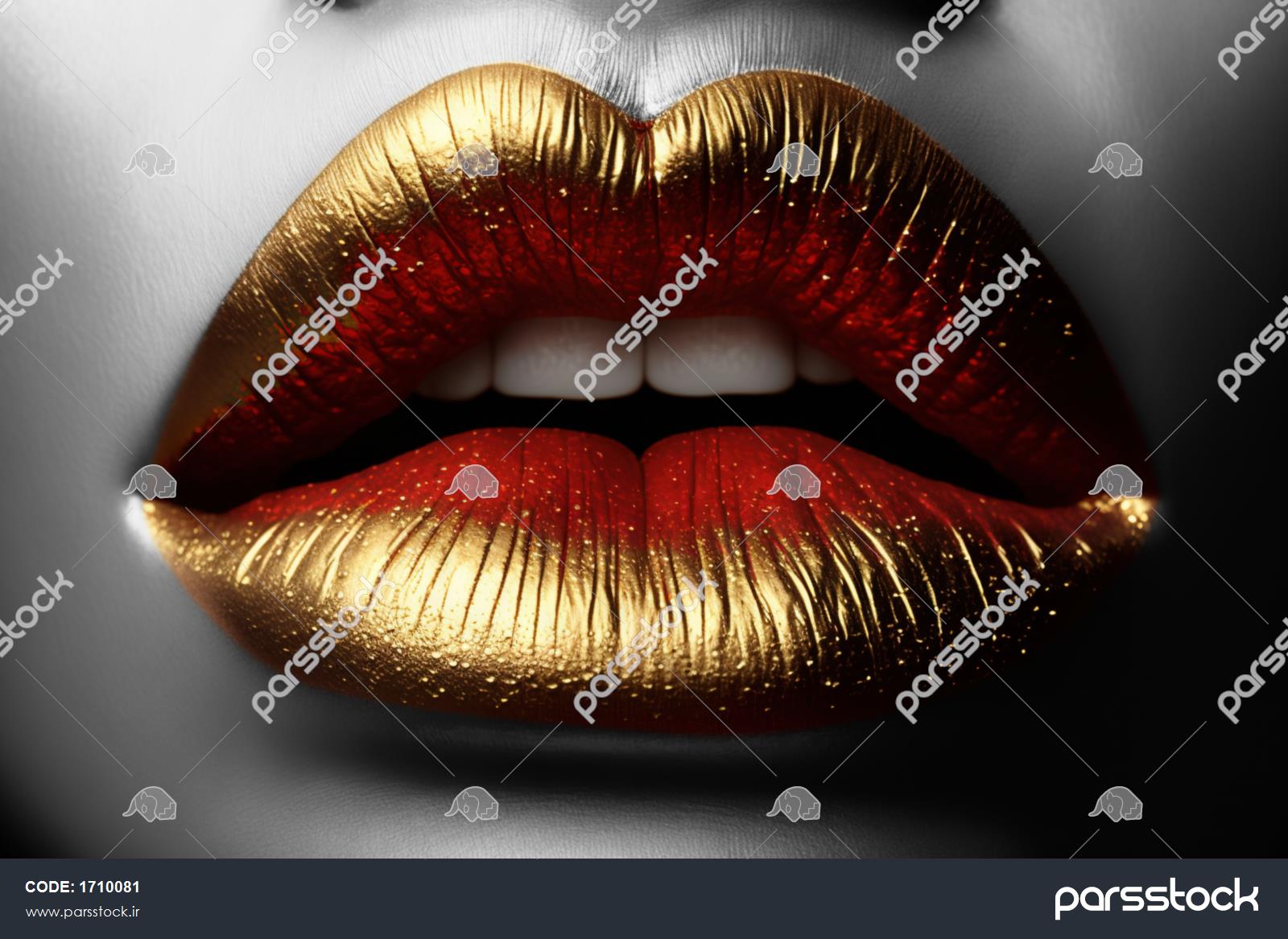 رژ لب طلایی نزدیک لب های طلایی فلزی آرایش زیبا لب های رنگ روشن روی دهان دختر مدل زیبا نمای نزدیک کلاک و سفید رژ لب فلزی نزدیک جدا شده در پس زمینه سیاه