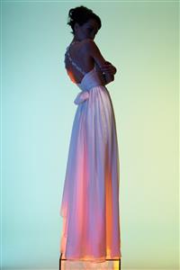خانم جوان زیبا با لباسی شیک در یک استودیو عکس ژست گرفته است مدل در نورافکن های رنگی روشن پرتره زنی با لباس عروس سفید عکاسی هنری