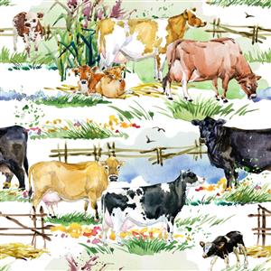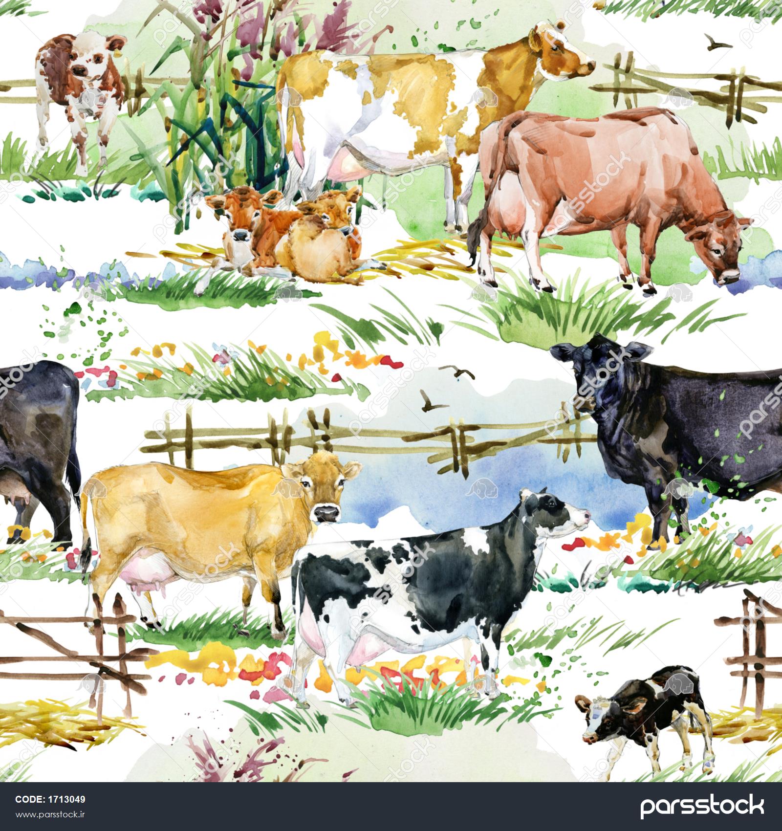 الگوی بدون درز با گاوهای شیری روی گلد نقاشی با دست حیوانات آبرنگ حیوانات مزرعه کشاورزی کشاورزی زندگی روستایی حیوان خانگی
