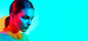 زن مدل مد بالا با ژست نورهای روشن رنگارنگ پرتره دختر زیبای با آرایش مد روز طراحی هنری آرایش رنگارنگ بیش از پس زمینه رنگارنگ زنده رقصنده باشگاه شبانه UV
