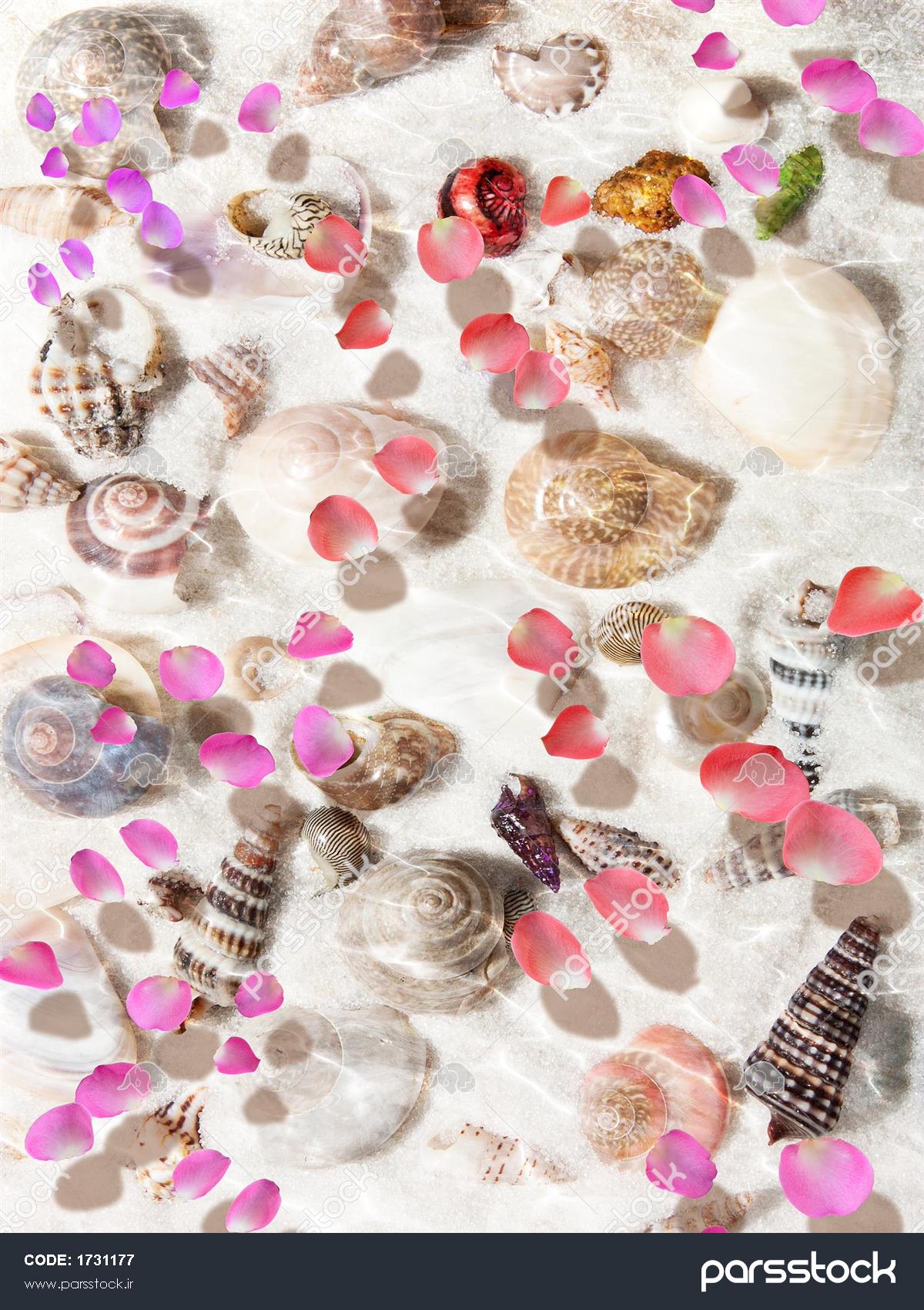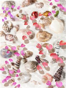 طرح کفپوش سه بعدی از رودخانه با صدف‌ها و گلبرگ‌های صورتی