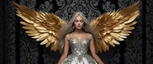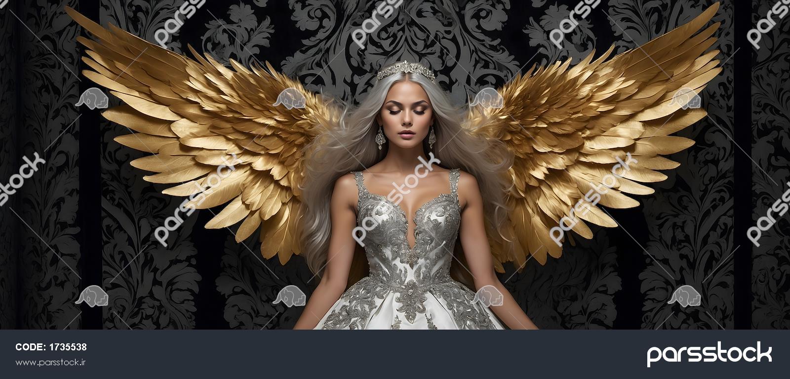 الهه با موهای نقره‌ای و بال‌های طلایی، لباس نقره‌ای و تاج نقره‌ای