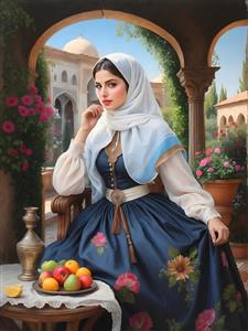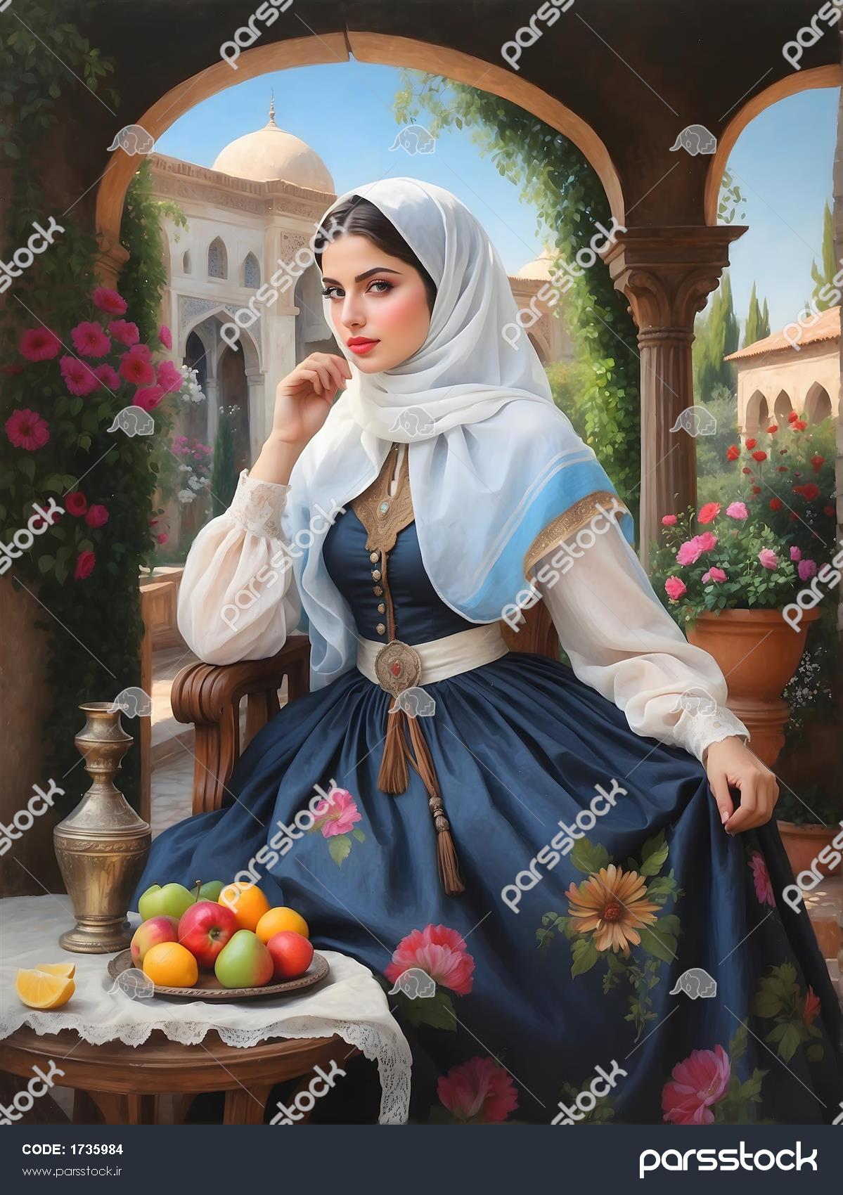 پرتره دختر قاجاری در لباس آبی سنتی و حیاط دلگشا
