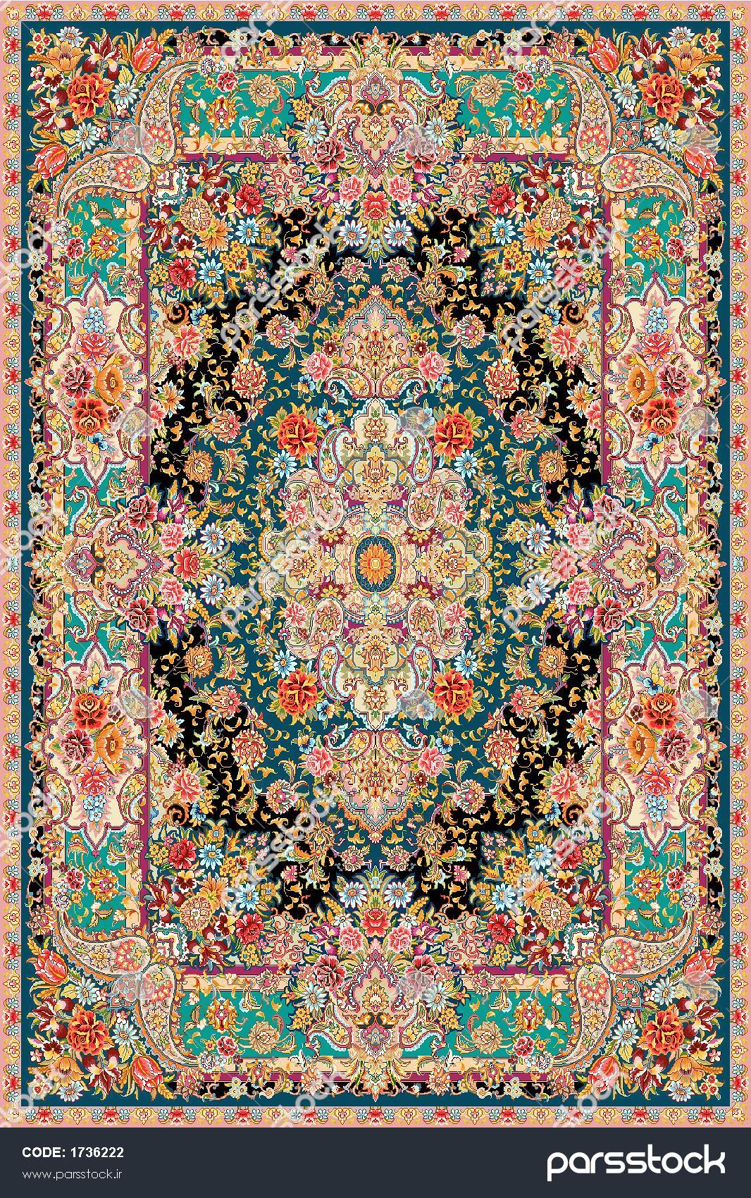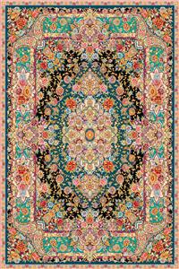 فرش باغ بهشت با زمینه‌ی مشکی و نقوش گل‌ و بته‌جقه رنگارنگ فیروزه‌ای و نارنجی طرح نازگل