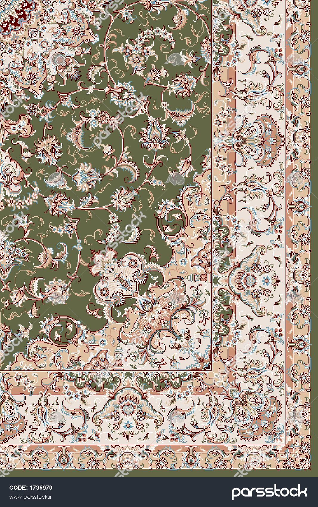 گوشه‌ای از فرش افشان با زمینه سبز زیتونی و گل‌های صورتی و برگ‌های سبزآبی با طرح‌های اسلیمی ظریف طرح بیتا