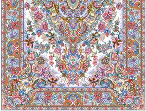 فرش سفید با نقوش بته جقه‌ای و گل‌های رنگارنگ و طرح‌های اسلیمی در هم تنیده طرح خزان