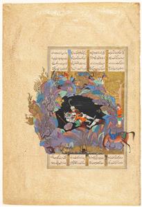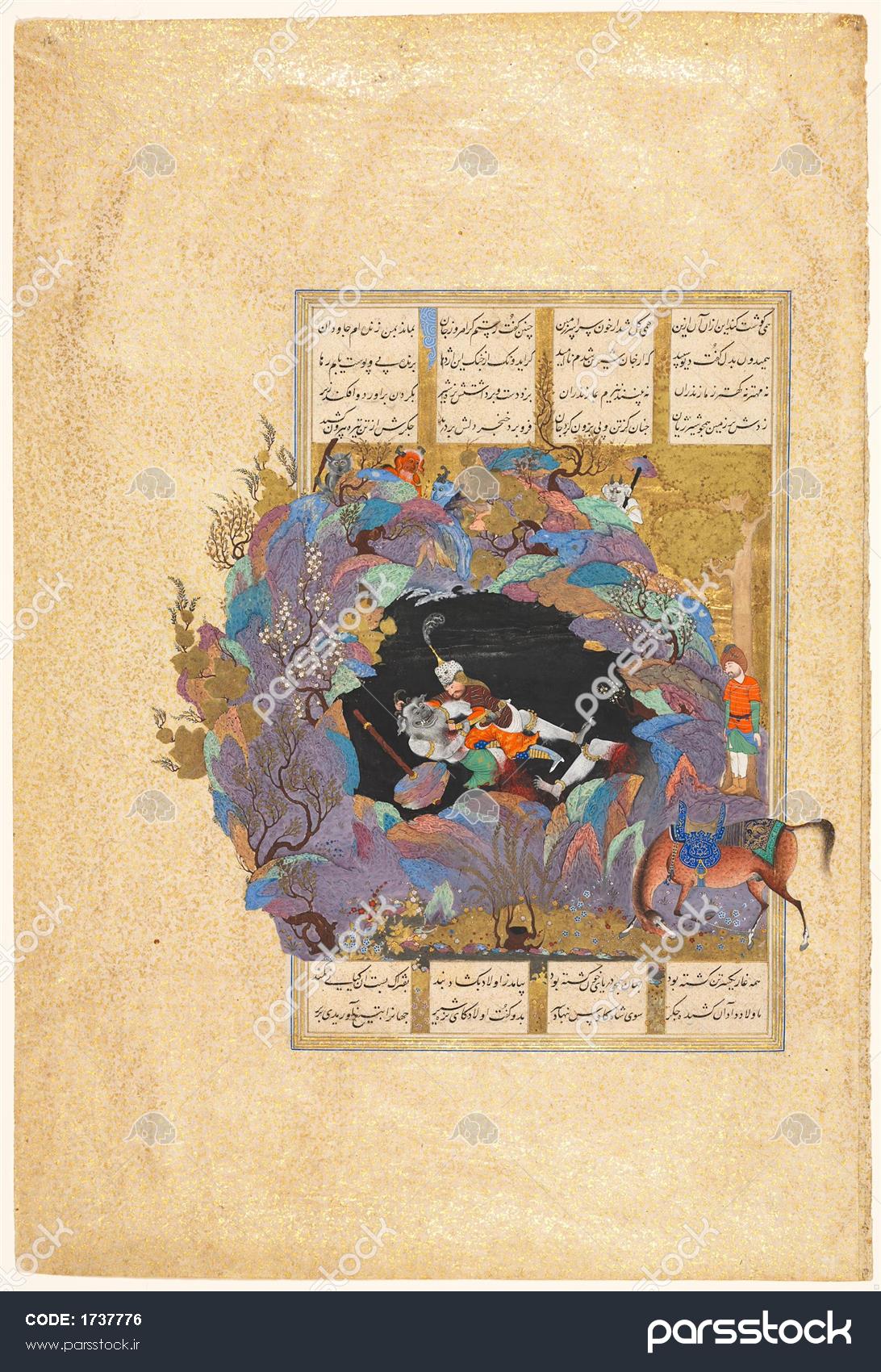 نگارگری خسرو و شیرین نظامی، دیدار خسرو و شیرین بر سر چشمه نگارگری عشاق، اثر حیدر، دوره صفوی، با نمادهای عاشقانه نگارگری رضا عباسی، جوان با بالاپوش خز در باغ، سبک صفوی اصفهان گیو پهلوان افسانه ای شاهنامه، رنگ روغن روی بوم نقاشی قهوه خانه ای صحنه کشته شدن سهراب به دست رستم از شاهنامه فردوسی نگارگری یافتن سام زال را برگ مصور از شاهنامه شاه اسماعیل دوم نگاره کشتن رستم دیو سپید را برگ نگارین از نسخه دستنویس شاهنامه فردوسی نگارگری رخش در چشمانداز زمستانی، با دو سوارکار و درختان نگارگری رستم با لباس پلنگی، کمان و تیردان، در کوهستان نگارگری رخش، اسب رستم در چشمانداز طبیعی با درختان و اسبهای دیگر نمایش همه