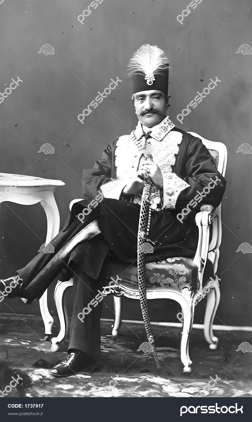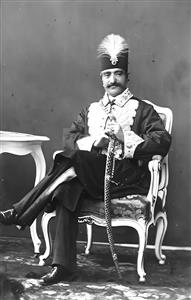 پرتره ناصرالدین شاه قاجار با لباس تشریفاتی عکس سیاه و سفید
