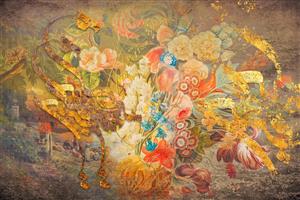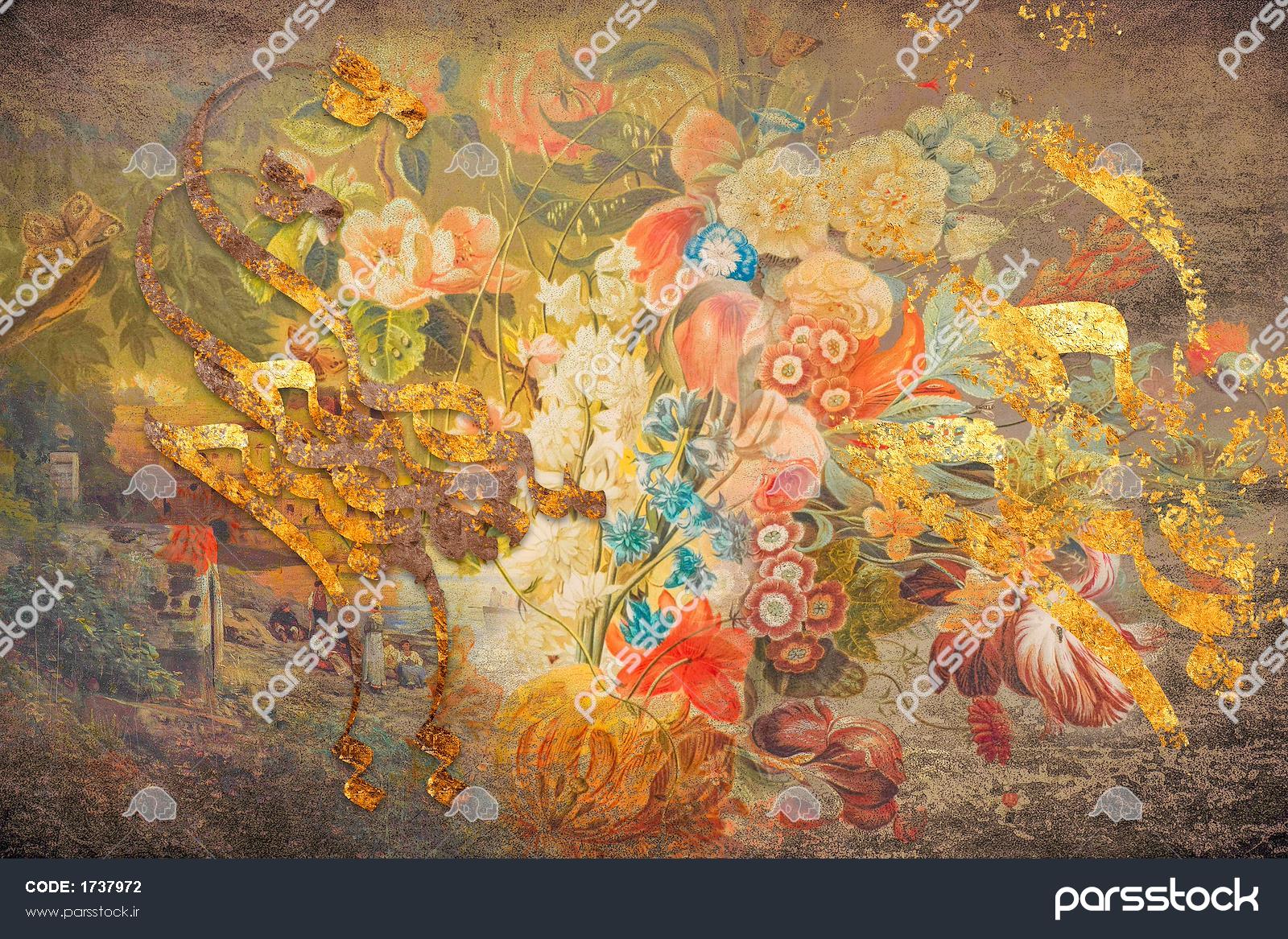 نقاشی دیجیتال گل و پرنده با تذهیب طلایی و نقوش سنتی