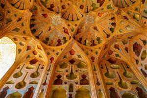 نمای کلی تالار موسیقی عالی قاپو اصفهان، سقف و پنجرههای خاص سقف عالی قاپو اصفهان، جزئیات گچبری و نقاشی تالار موسیقی سقف عالی قاپو اصفهان، طرحهای هنری و آلات موسیقی توخالی معماری داخلی عالی قاپو اصفهان، تالار موسیقی با طاقهای زیبا سقف عالی قاپو اصفهان، جزئیات طرحهای گچبری و رنگآمیزی سقف مربع شکل عالی قاپو اصفهان، طرحهای هندسی و رنگارنگ گوشهای از سقف عالی قاپو اصفهان، با نقوش هندسی و تزئینات سقف تالار عالی قاپو اصفهان، با نقوش هندسی و تزئینات نمای داخلی عالی قاپو، سقف و دیوارهای مزین به نقوش سقف تزئینی عالی قاپو اصفهان، با نقوش پیچیده و رنگارنگ نمایش همه