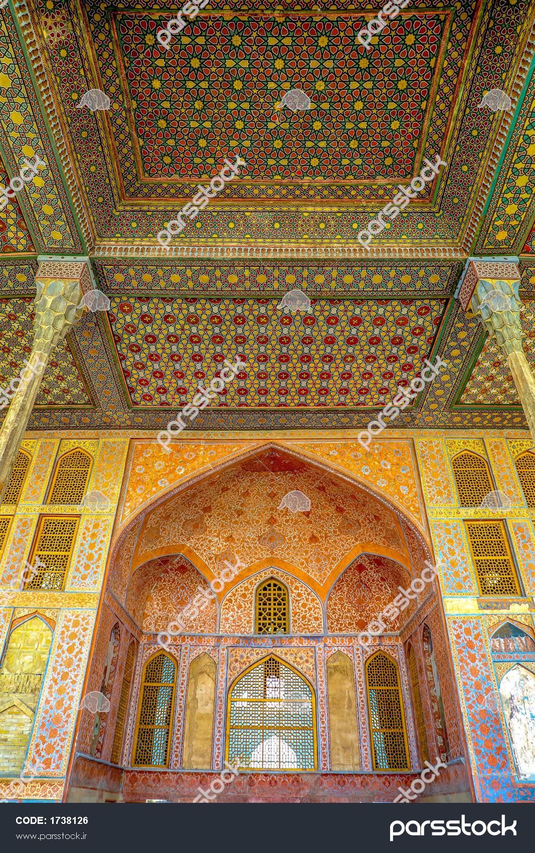 دیوارنگارههای عالی قاپو اصفهان، جزئیات معماری صفوی سقف ایوان عالی قاپو اصفهان، نقوش چوبی و طرحهای هندسی سقف و دیوارهای عالی قاپو اصفهان، نقوش زیبا و پنجرههای مشبک سقف زیبای عالی قاپو اصفهان، جزئیات معماری صفوی سقف عالی قاپو اصفهان، طرحهای هندسی و رنگارنگ در نور آفتاب نمای کلی تالار موسیقی عالی قاپو اصفهان، سقف و پنجرههای خاص سقف عالی قاپو اصفهان، با طراحی ستارهای و تزئینات بینظیر سقف عالی قاپو اصفهان، جزئیات گچبری و نقاشی تالار موسیقی سقف و دیوارهای تالار موسیقی عالی قاپو، با طرحهای زیبا سقف و دیوارهای تالار موسیقی عالی قاپو اصفهان، طرحهای آلات موسیقی نمایش همه