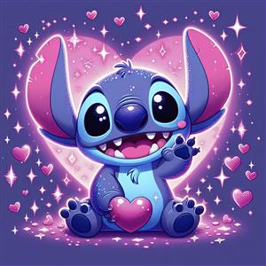پوستر دکوراتیو استیچ نشسته در قلب درخشان با زمینه بنفش