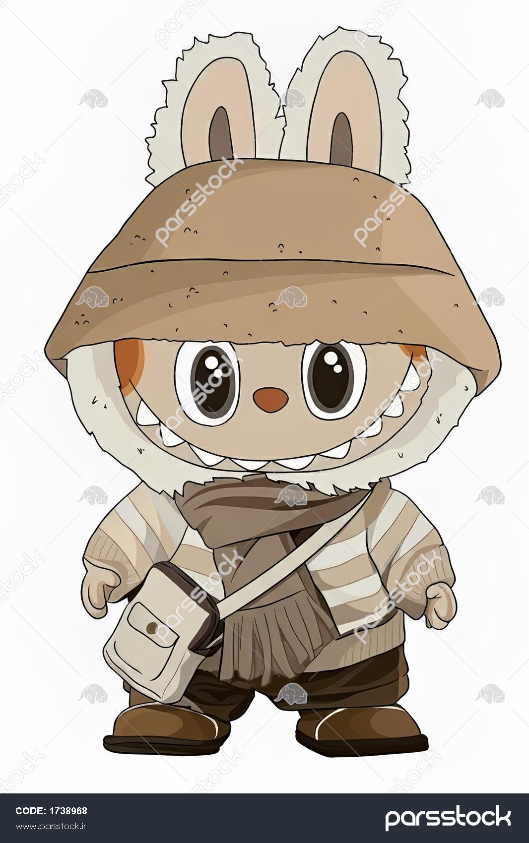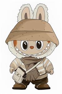 تصویر لبوبو کوهنورد با کلاه، ژاکت راه راه، شال گردن و کیف رودوشی در پس زمینه سفید