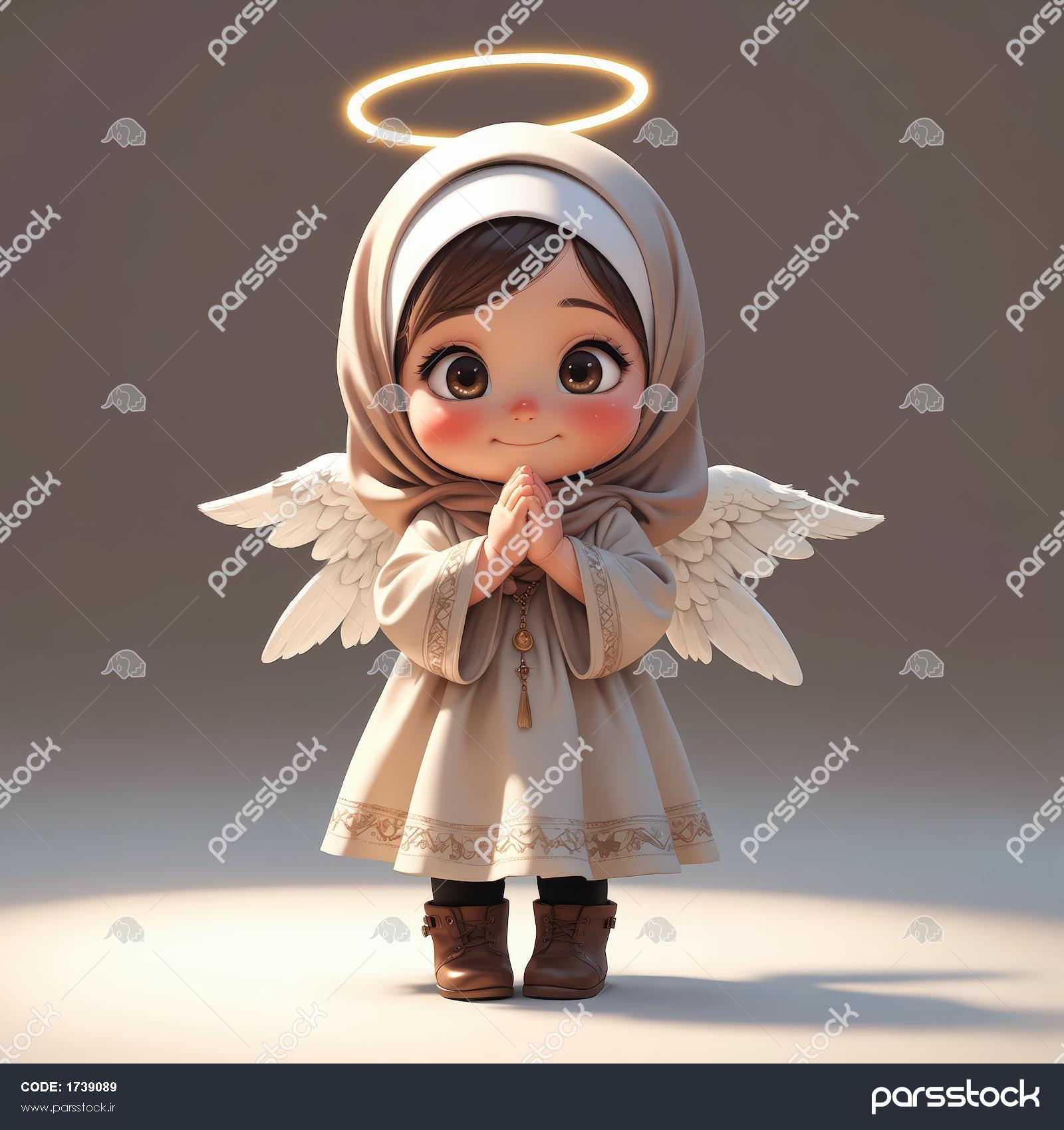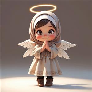 وکتور فرشته دختر کارتونی با حجاب بژ، لباس سفید و چکمه‌های قهوه‌ای، در حال نیایش با هاله‌ی طلایی