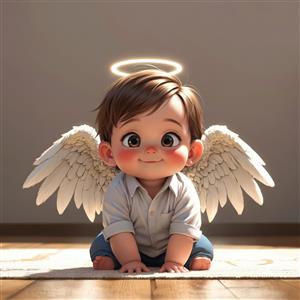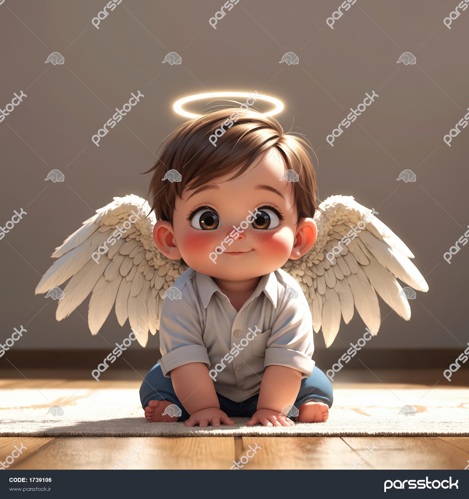 تصویر سه بعدی کودک فرشته پسر کارتونی شاد و خندان با بال‌های بزرگ و هاله‌ی نور طلایی