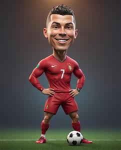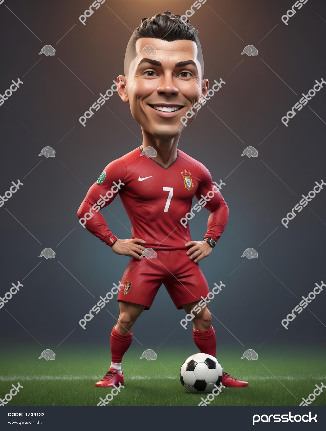 پوستر ورزشی کاراکتر کریستیانو رونالدو با لباس قرمز و توپ روی زمین چمن