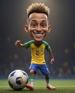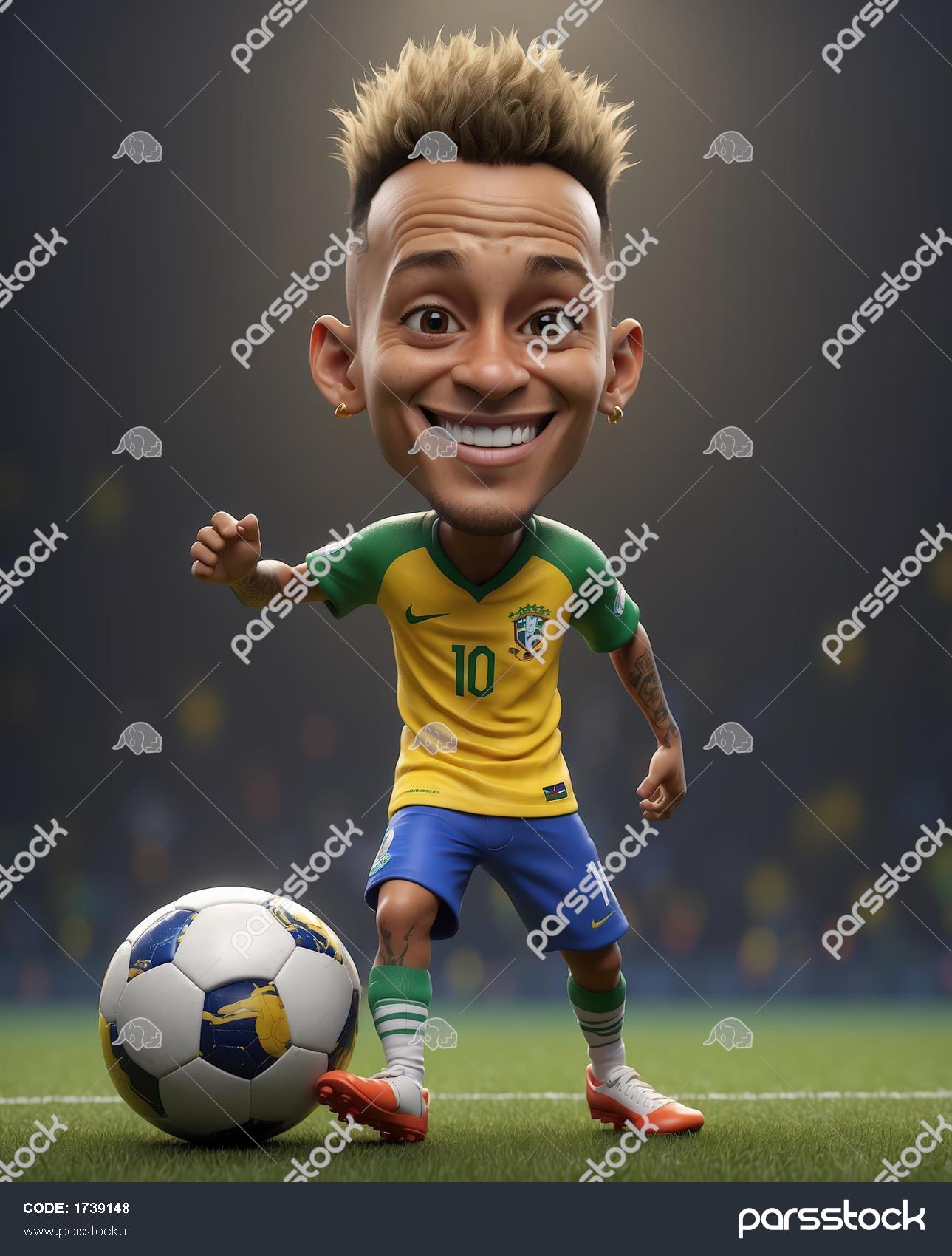 کاریکاتور نیمار در حال کنترل توپ بزرگ با کیت برزیل در محیط استادیوم با نورپردازی تیره