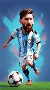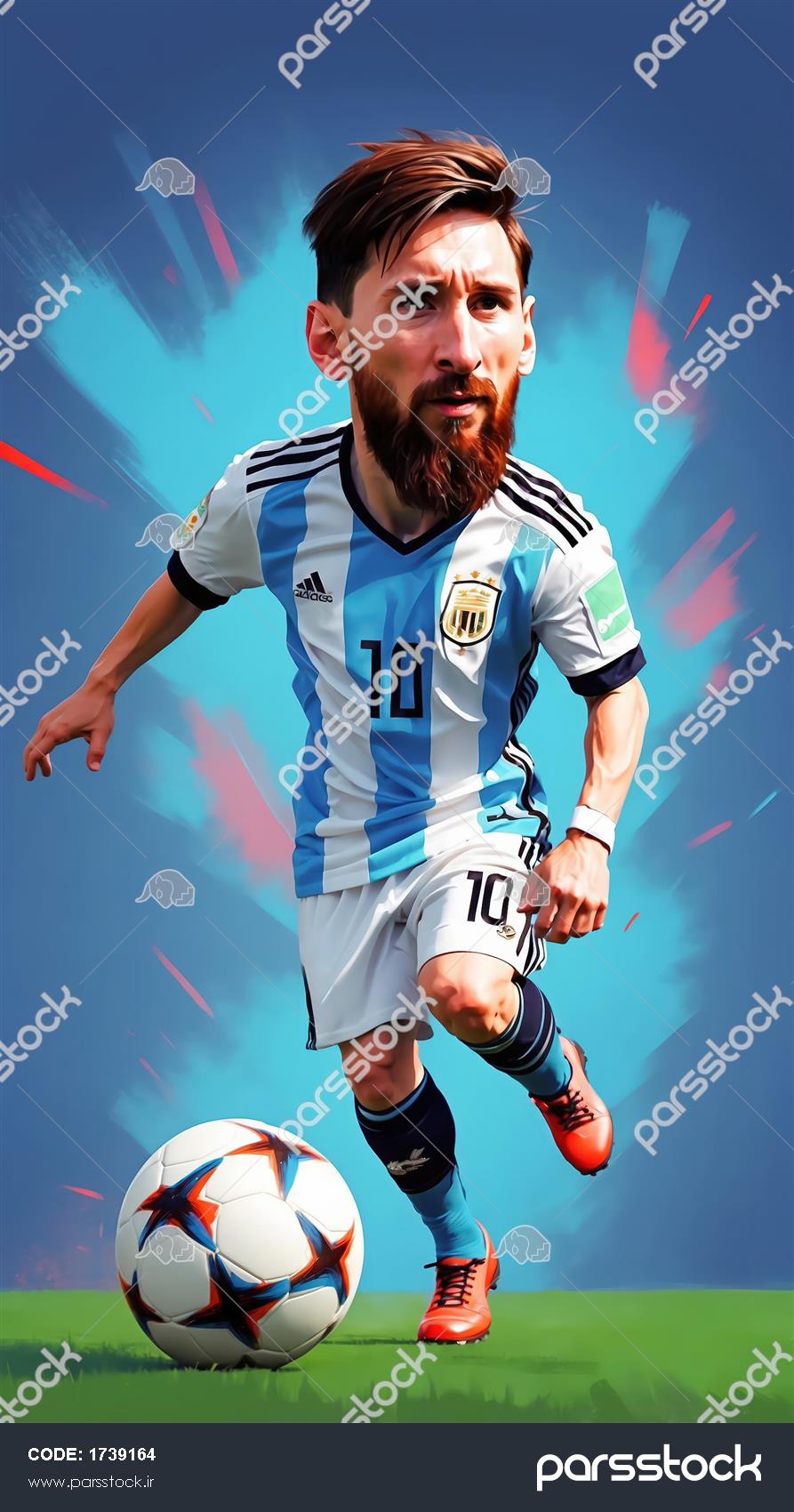 کاریکاتور مسی با ریش و کیت آرژانتین در حال دریبل زدن با پس‌زمینه آبی تیره و افکت‌های خطی آبی روشن و قرمز