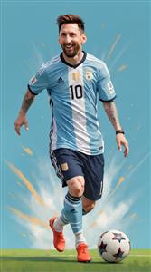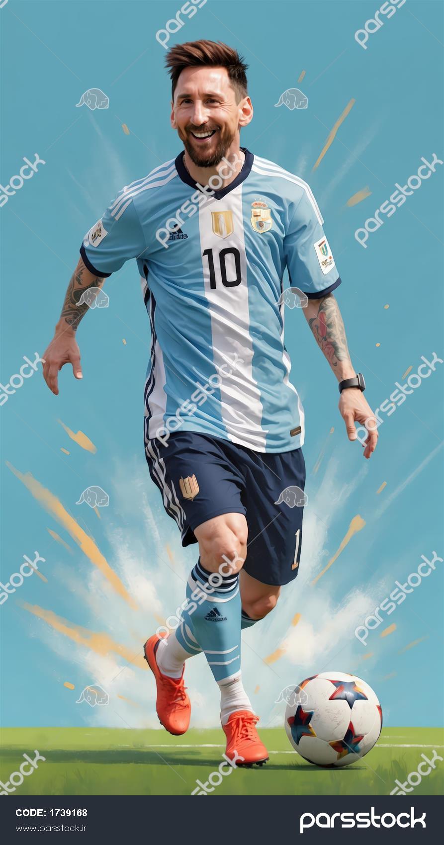 تصویر مسی با لبخند و لباس آرژانتین در حال کنترل توپ با پس‌زمینه آسمانی آبی روشن و افکت انفجار نارنجی