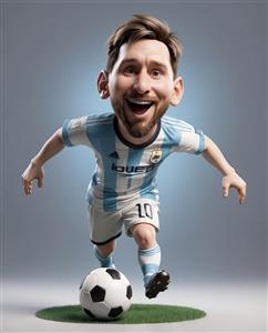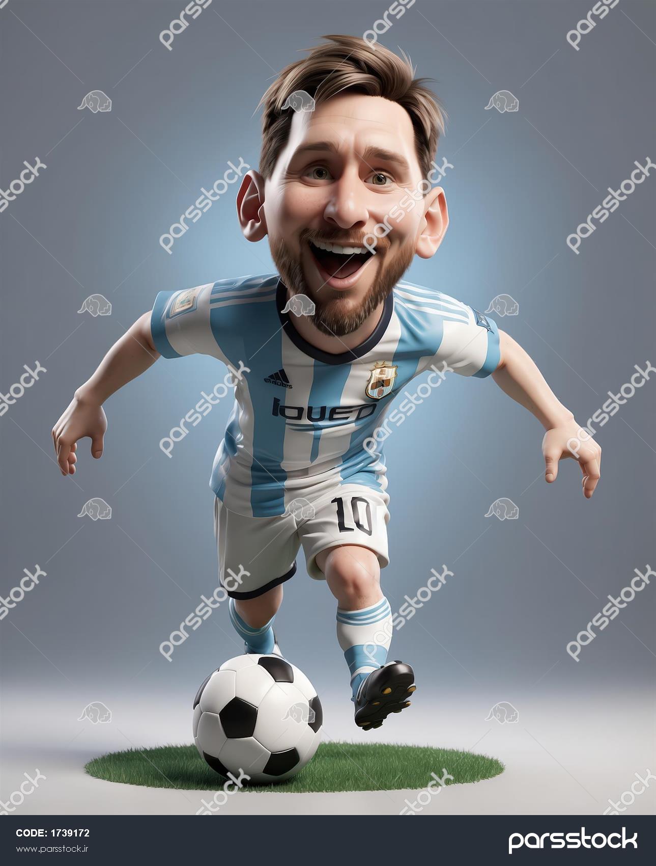 کاریکاتور خوشحال مسی در حال دویدن با توپ و کیت آرژانتین روی سکوی چمن و پس‌زمینه آبی خاکستری