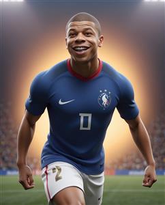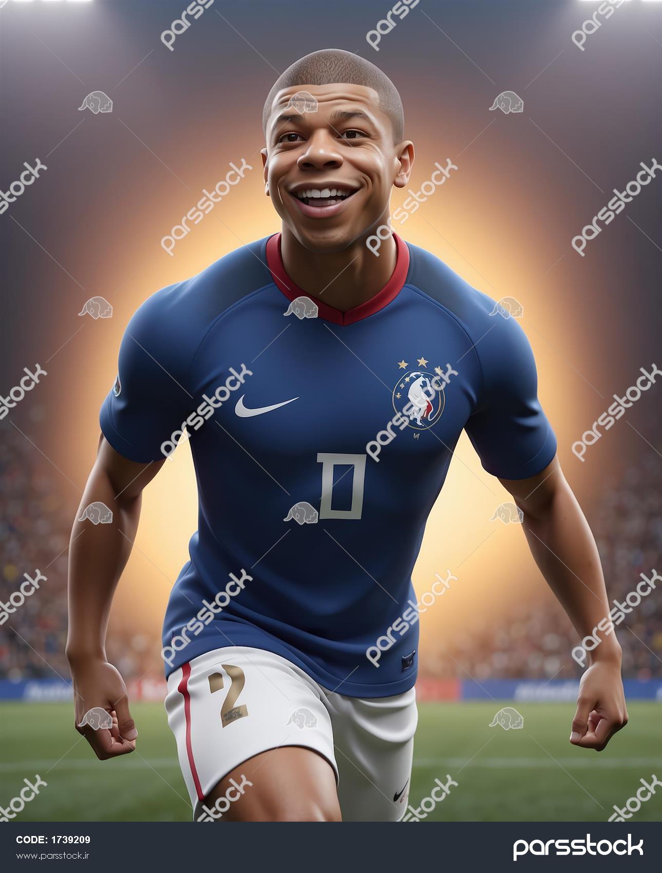 تصویر نزدیک فوتبالیست در حال شادی و دویدن در استادیوم با لباس تیم ملی فرانسه (عکس استوک)