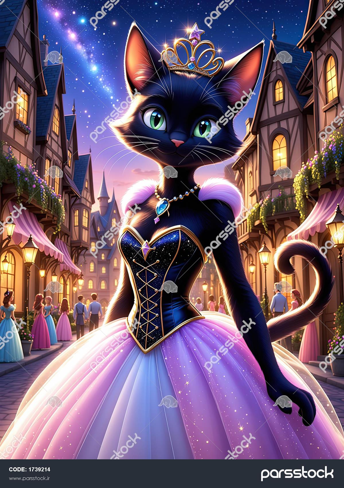 عکس گربه مشکی پرنسسی با لباس مجلسی پف‌دار و تاج الماس در کوچه قدیمی اروپایی زیر آسمان شب