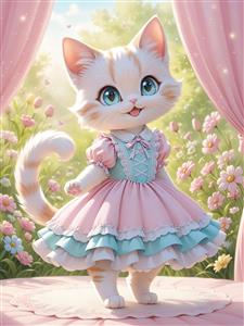 صویر باکیفیت گربه بامزه با چشمان آبی در میان پرده‌های صورتی و گل‌های بهاری