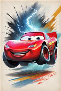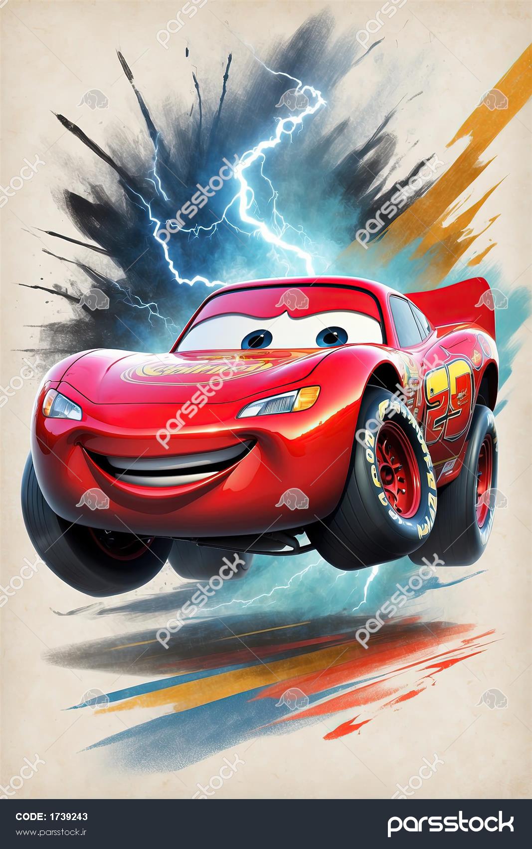 تصویر لایتنینگ مک‌کوئین در حال دریفت با دود، پس‌زمینه گرافیکی با افکت سرعت