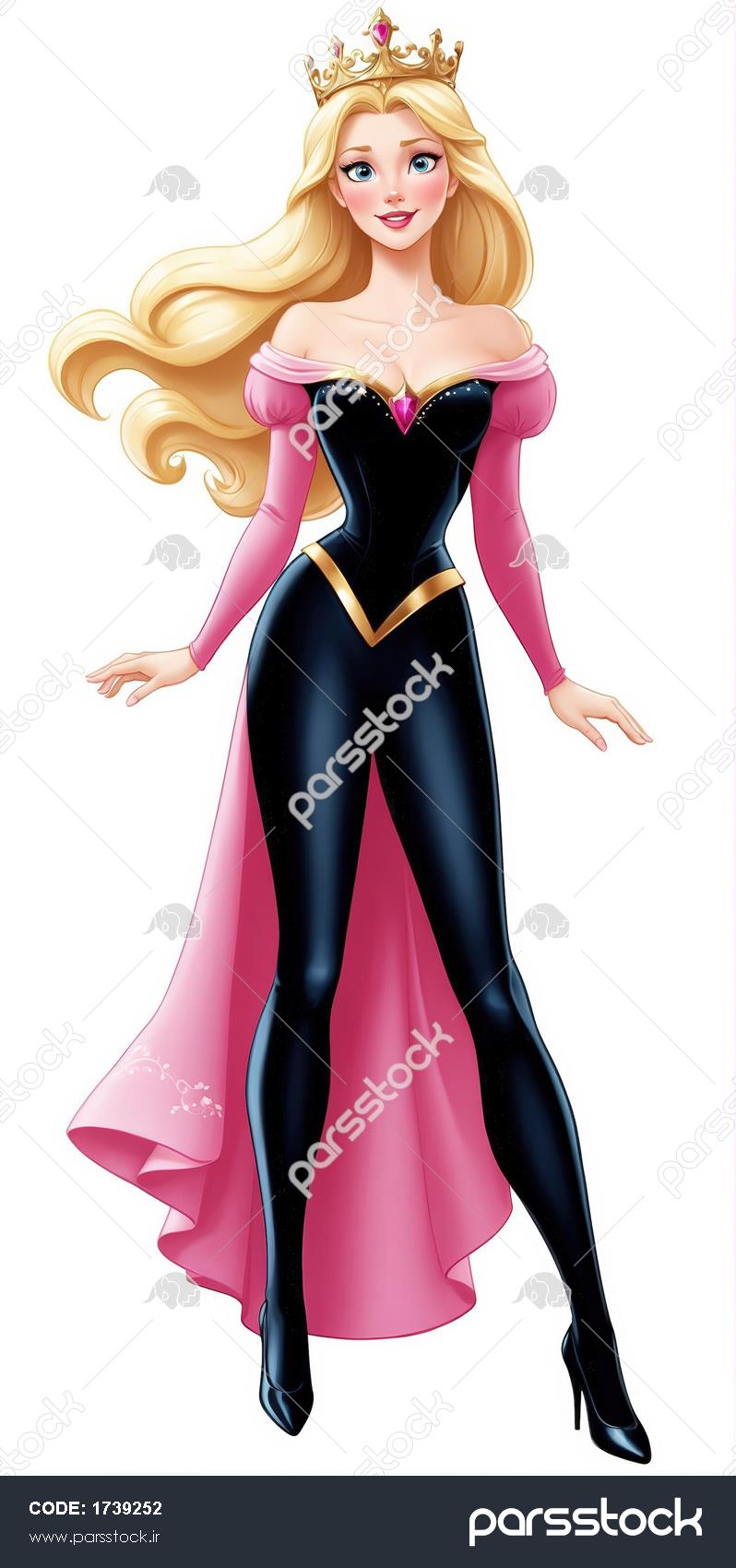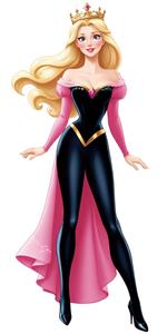 آرورا با لباس مشکی و لگینگ براق، آستین‌های بلند صورتی و تاج طلایی