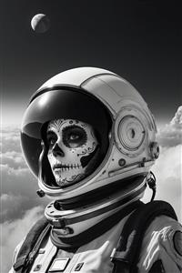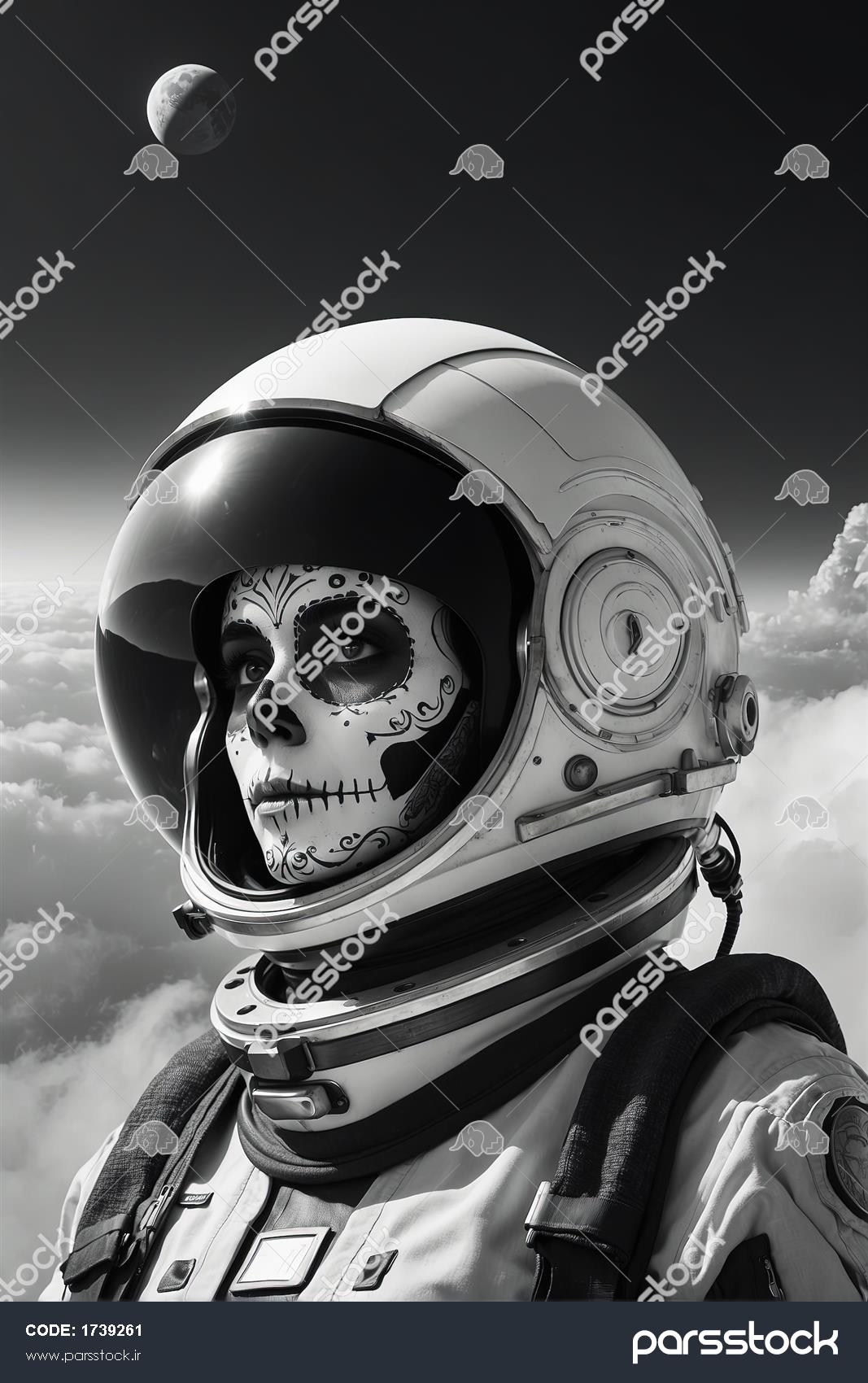 پرتره زن فضانورد با گریم جمجمه در کلاه ایمنی، ایستاده بر فراز ابرها با ماه در بالا