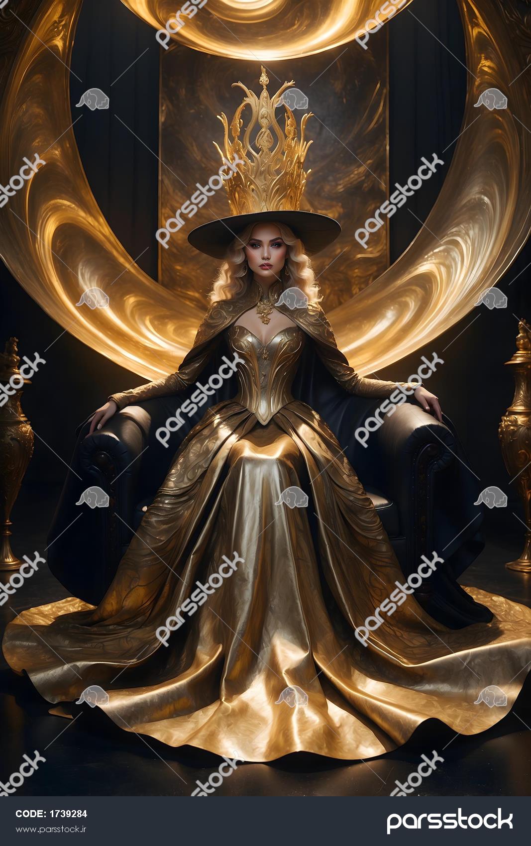 زن نشسته بر صندلی سلطنتی با تاج و شنل، لباس طلایی فاخر با جزئیات لوکس پرتره زن سلطنتی با تاج پردار طلایی و لباس مجلسی مشکی و طلایی در بکگراند لاکچری زن نشسته بر تخت سلطنتی طلایی با لباس شب مشکی و طلایی، عکس باکیفیت لوکس تصویر زن با لباس پرنسسی دامن پفدار طلایی و مشکی، لباس بالماسکه با تاج پر در سالن مجلل زن نشسته بر تخت سلطنت طلایی با لباس شب مشکی و تزئینات طلایی، عکس فشن لاکچری تصویر فشن زنانه در عمارت با لباس بالماسکه و کلاه، ترکیب رنگ طلایی و مشکی سلطنتی مدل زن با لباس مجلسی مشکی و طلایی دکلته و کلاه، لباس شب سلطنتی با برش بلند و پارچههای مواج پرتره ملکه بلوند با تاج و گردنبند سنگ قرمز، بانوی سلطنتی با لباس آبی و طلایی تصویر زن اشرافی با لباس مجلسی طلایی و مشکی دراماتیک، پسزمینه لوکس طلایی فرشته باوقار با تاج و بالهای طلایی در لباس مجلسی سلطنتی نمایش همه