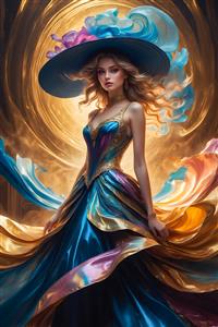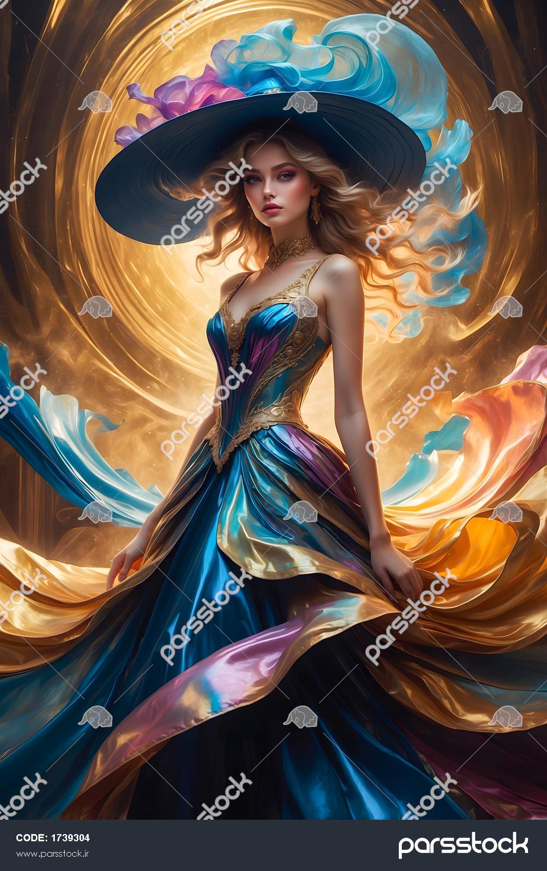 بانو با کلاه آبی و طلایی و لباس رنگی