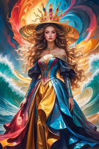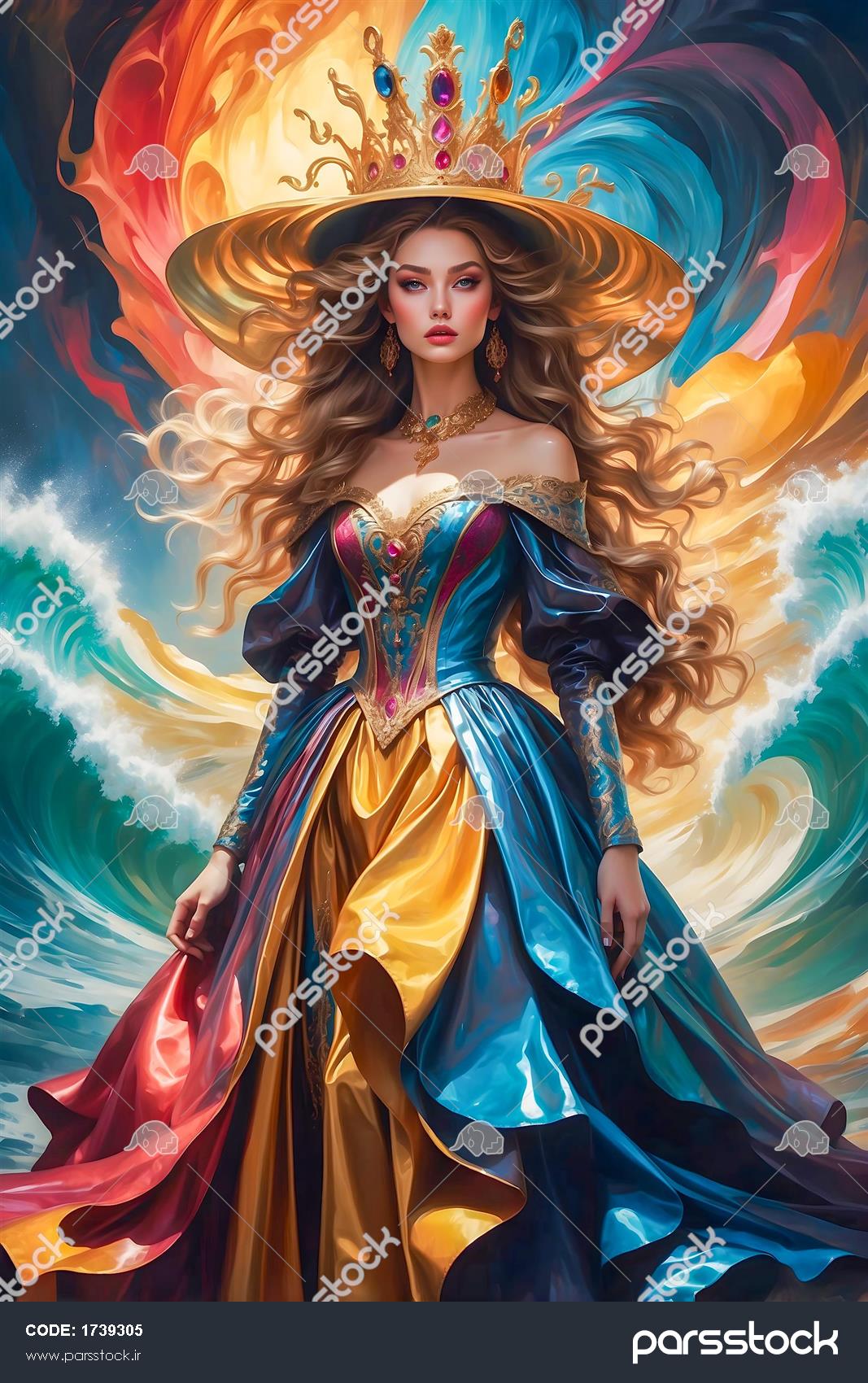 بانو با کلاه آبی و طلایی و لباس رنگی مانکن با لباس رنگی با کلاه تزیینی ملکه با لباس رنگی و کلاه رقص با لباس طلایی سلطنتی پرتره زن با کلاه گلدار و لباس رنگینکمانی سنتی، بانوی اشرافی با جواهرات بزرگ و رنگی مدل زن با کلاه و لباس شب مشکی طلایی با پارچه موجدار، عکس فشن لاکچری لباس رنگارنگ با کلاه پهن زن نشسته بر تخت سلطنت طلایی با لباس شب مشکی و تزئینات طلایی، عکس فشن لاکچری مدل زن با لباس مجلسی مشکی و طلایی دکلته و کلاه، لباس شب سلطنتی با برش بلند و پارچههای مواج زن نشسته بر تخت سلطنتی طلایی با لباس شب مشکی و طلایی، عکس باکیفیت لوکس نمایش همه