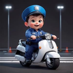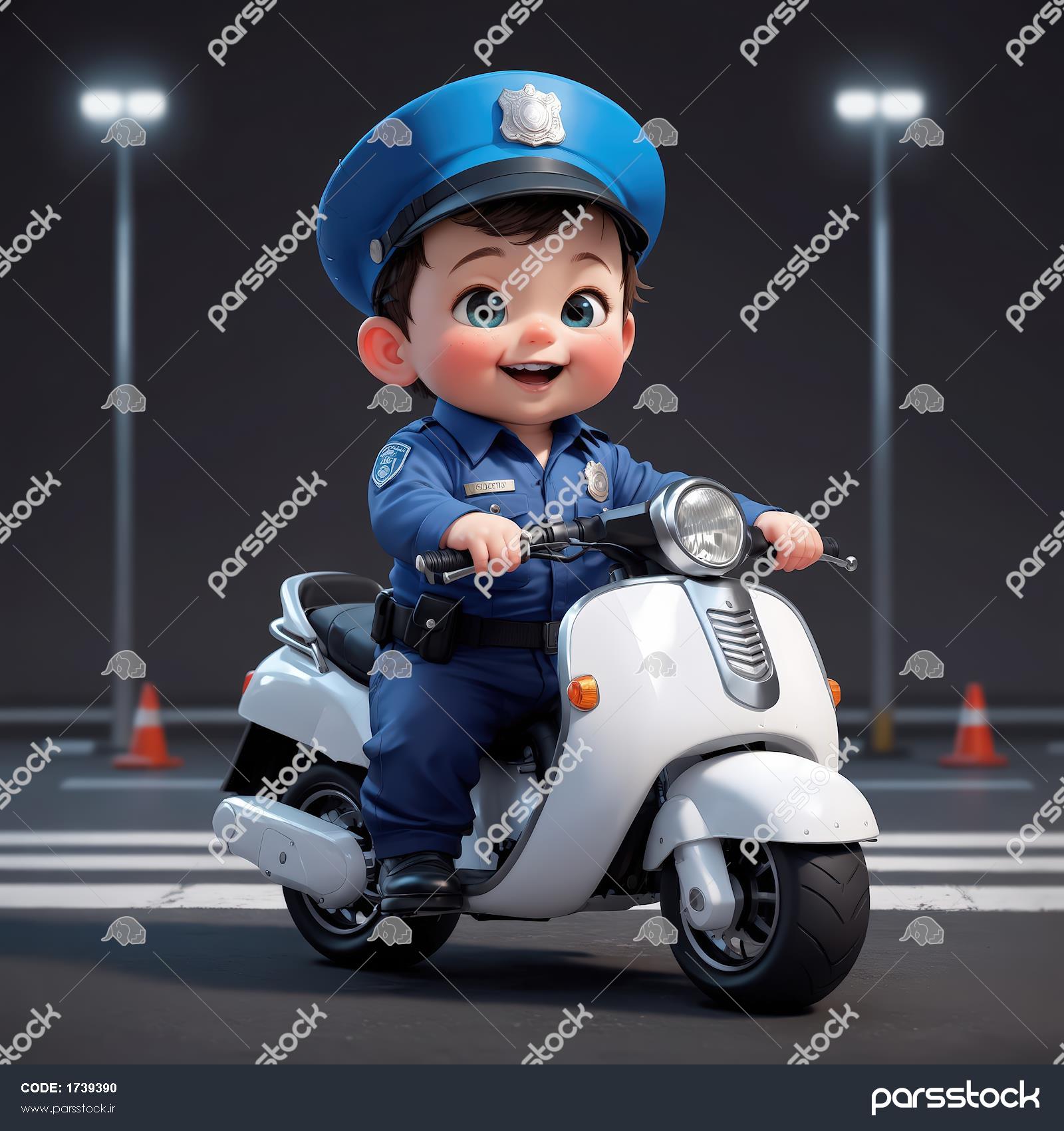 کارتون پسر بچه پلیس با کلاه آبی و اسکوتر سفید در پارکینگ یا خیابان تصویر فانتزی جذاب