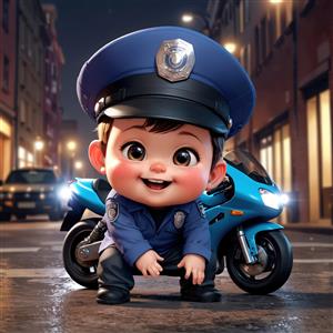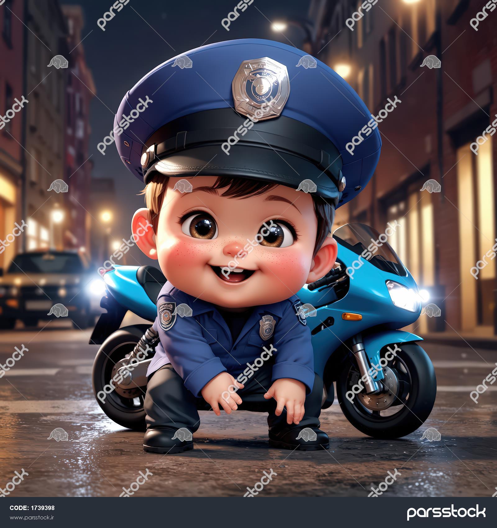 تصویر اورجینال کودک پلیس شاد در شب، نشسته در کنار موتور آبی در خیابان مناسب پوستر دیواری