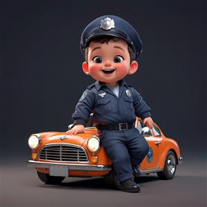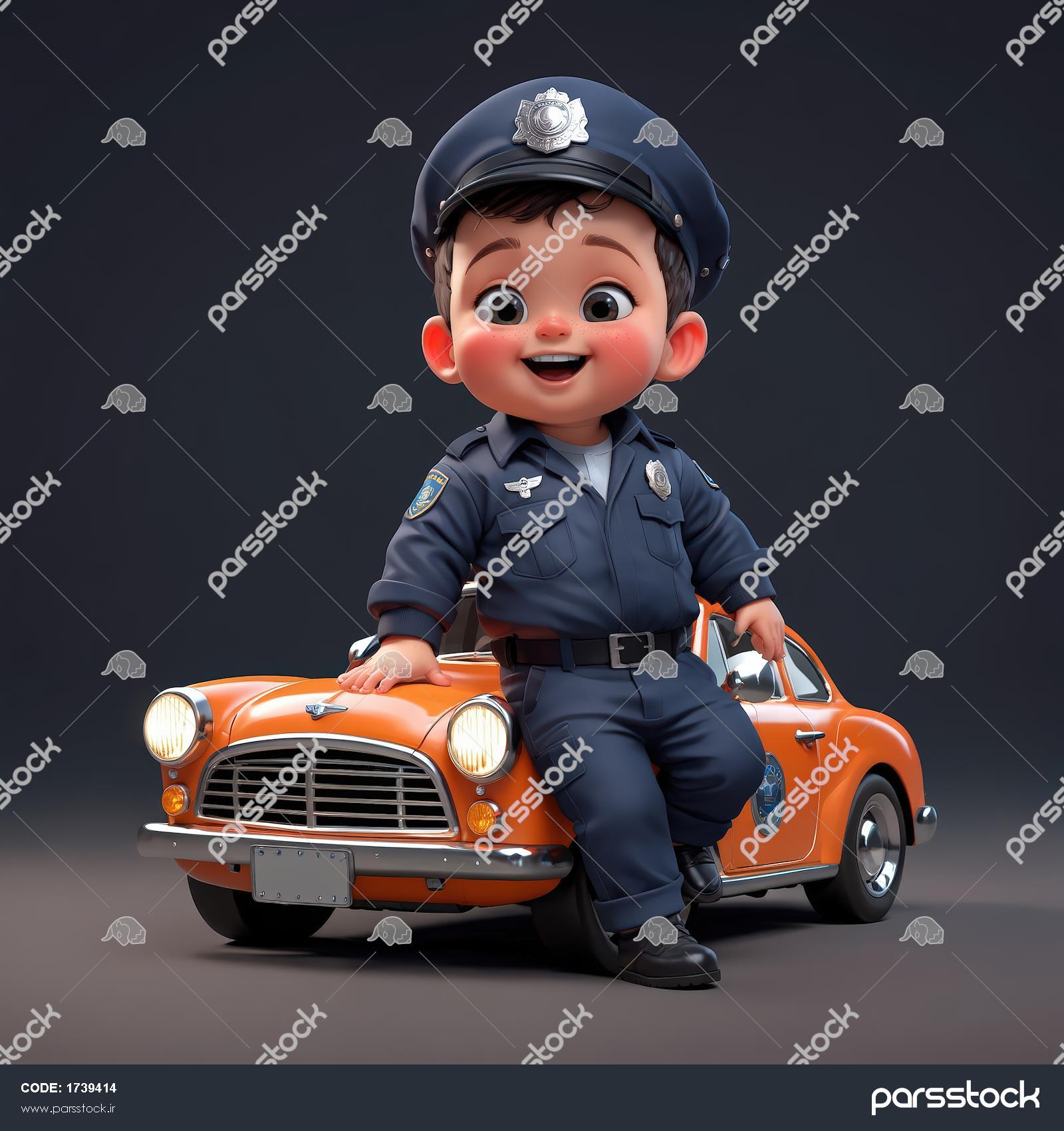 تصویر اورجینال کودک پلیس تکیه داده به خودرو پلیس مینی نارنجی فانتزی برای طراحی پوستر