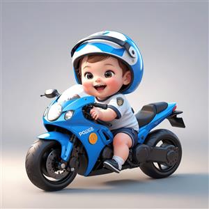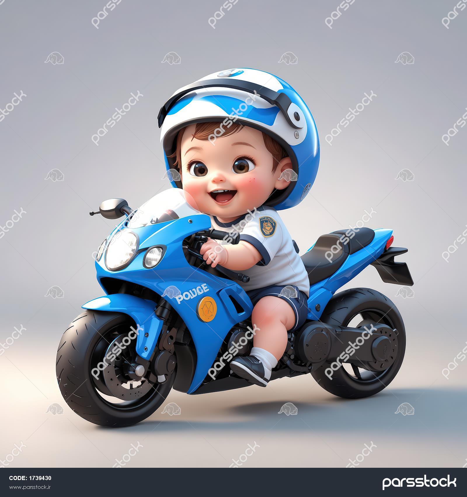 عروسک پسر شاد با کلاه ایمنی پلیس و سوار بر موتور سیکلت اسپرت آبی و سفید