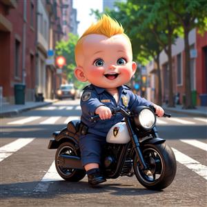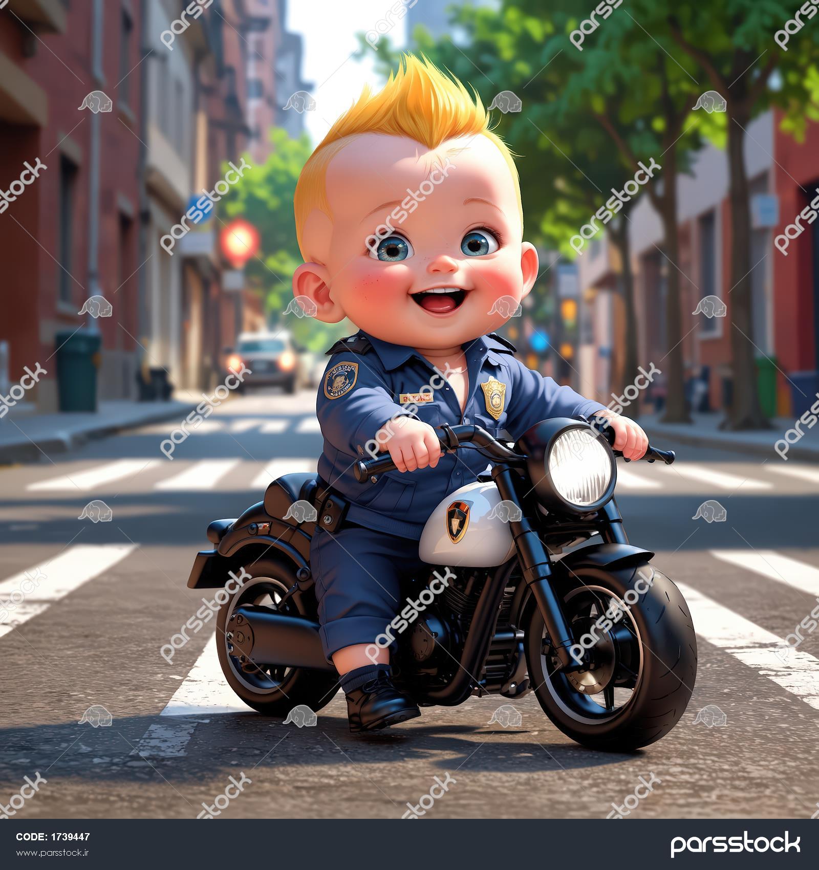 تصویر اورجینال عروسک پسر با موهای زرد و لباس پلیس سوار بر موتور در خیابان شهر