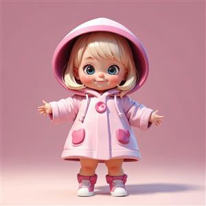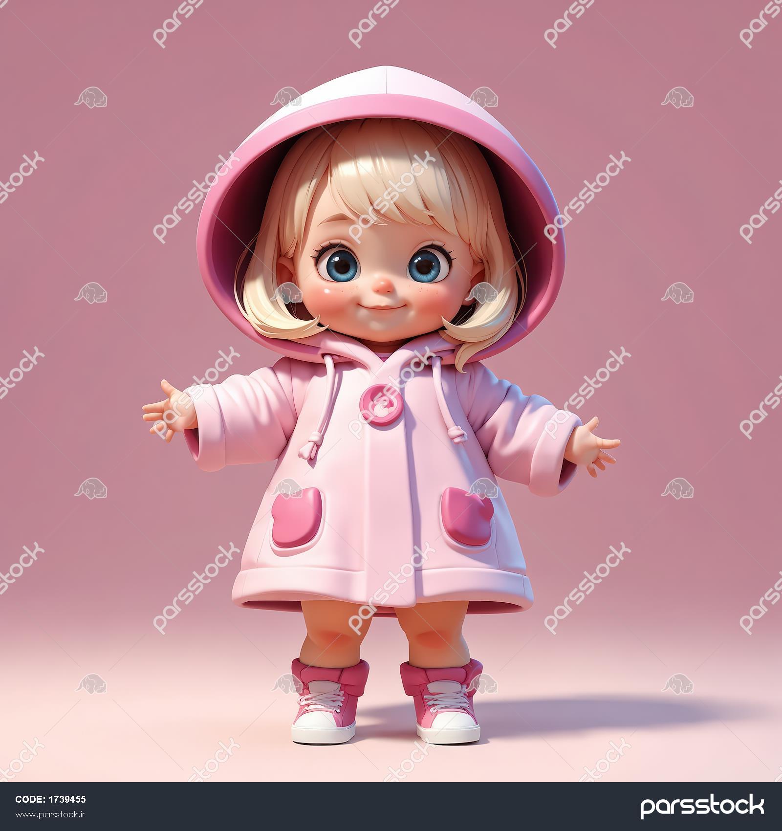 تصویر باکیفیت عروسک دختر کوچک با بارانی صورتی و جیب‌های قلبی در پس‌زمینه ساده