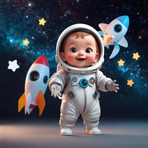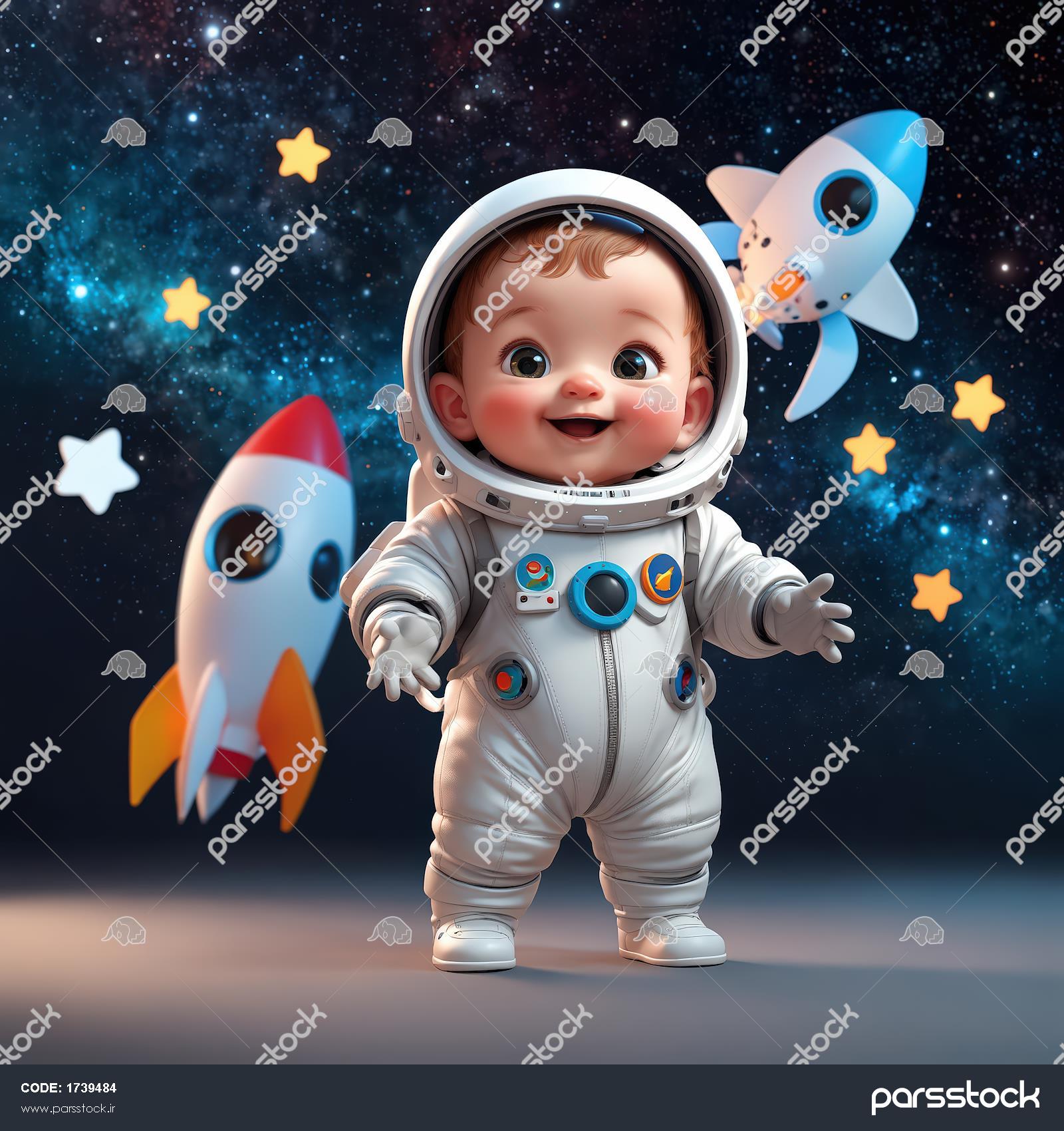 عکس استوک کودک فضانورد با دو موشک در حال پرواز و پس‌زمینه کهکشانی، مناسب چاپ عریض بوم