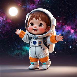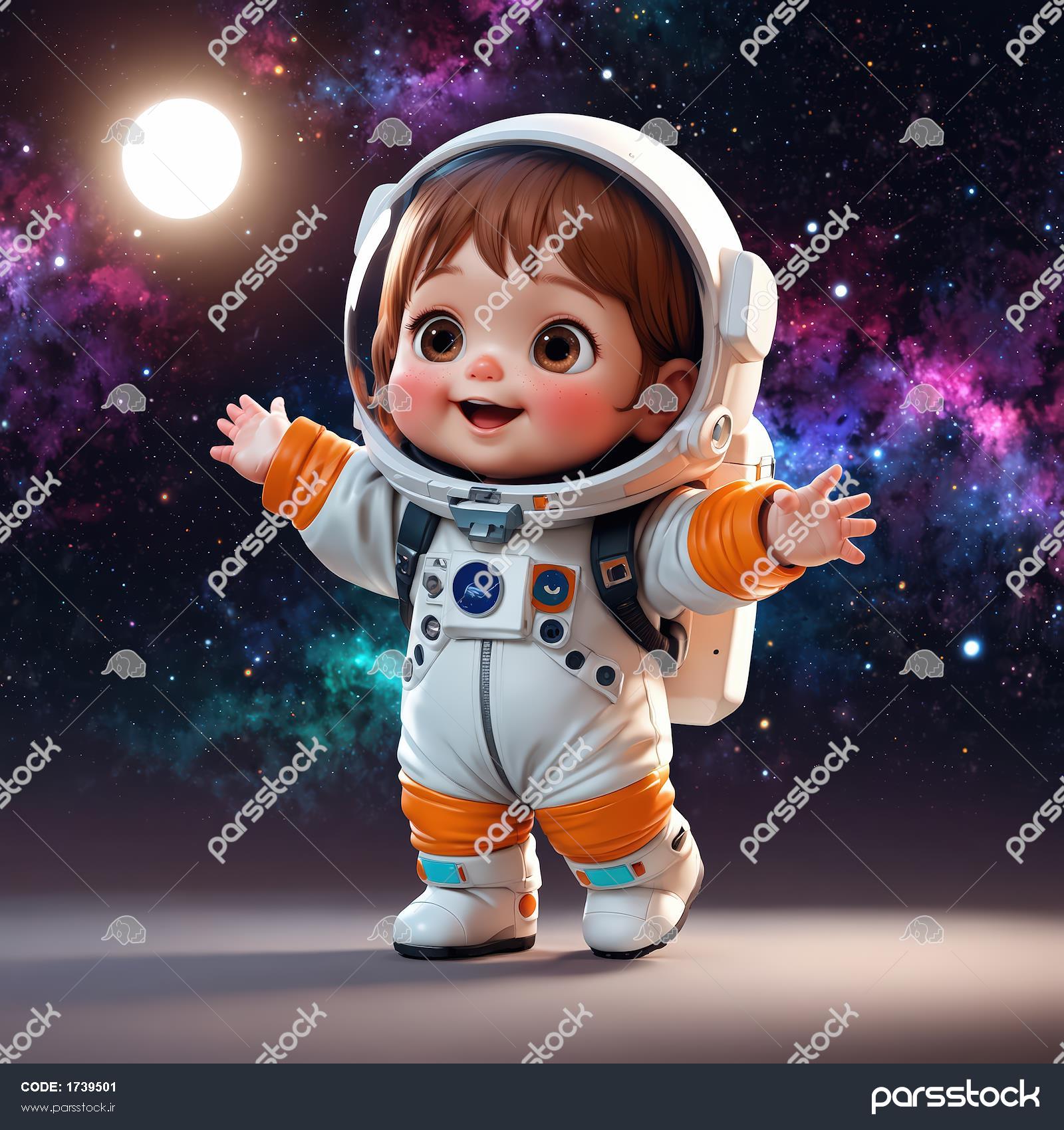 تصویر کودک فضانورد با لباس نارنجی و پس‌زمینه کهکشان رنگین‌کمانی، مناسب چاپ عریض دکوراسیون