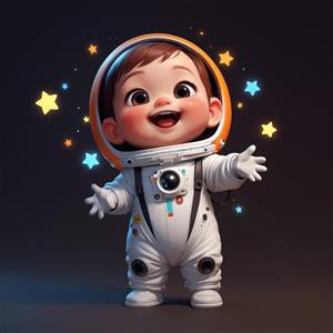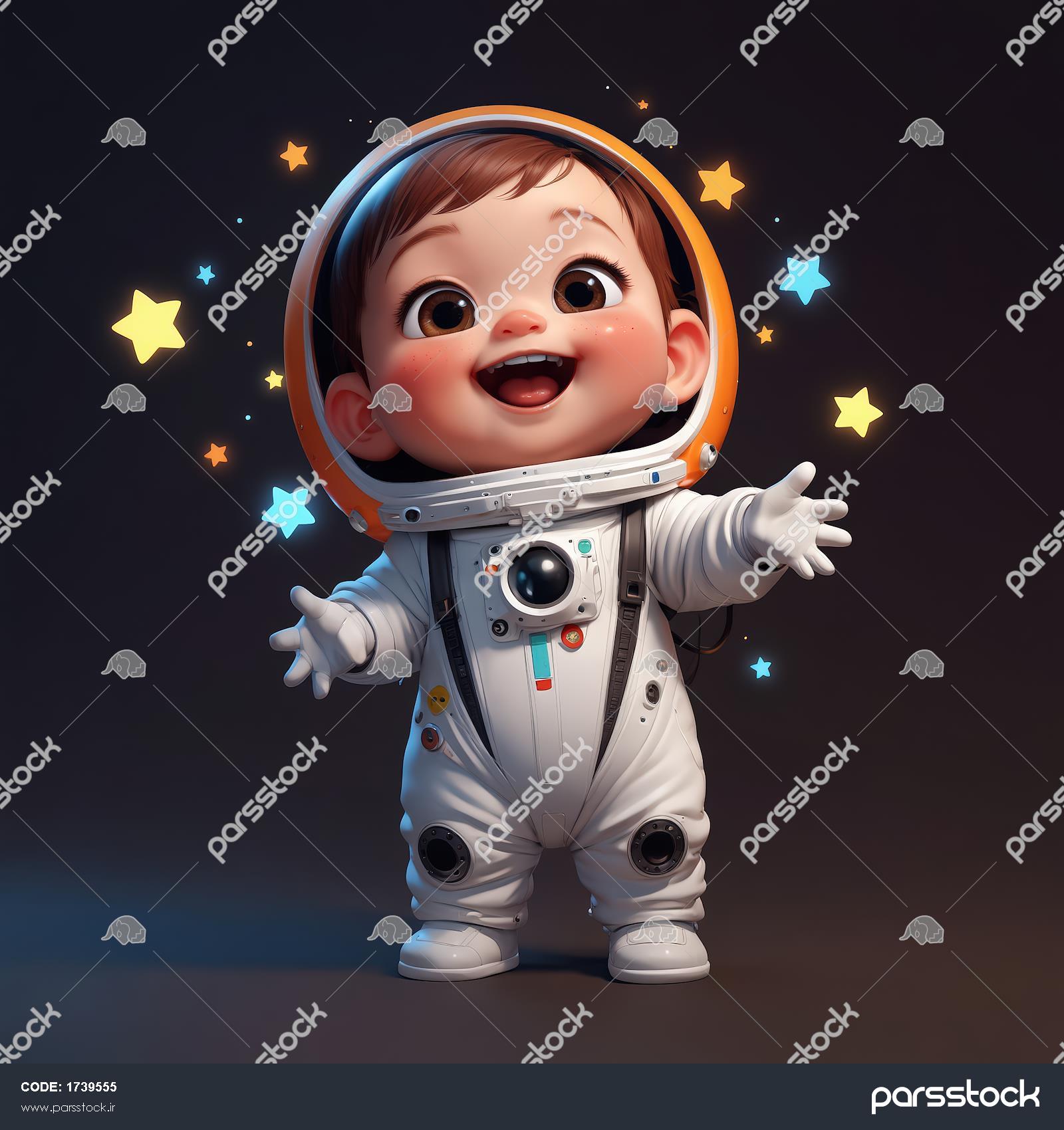 دانلود عکس باکیفیت کودک خندان فضانورد با کلاه نارنجی و درخشش ستاره‌ها