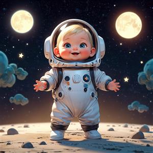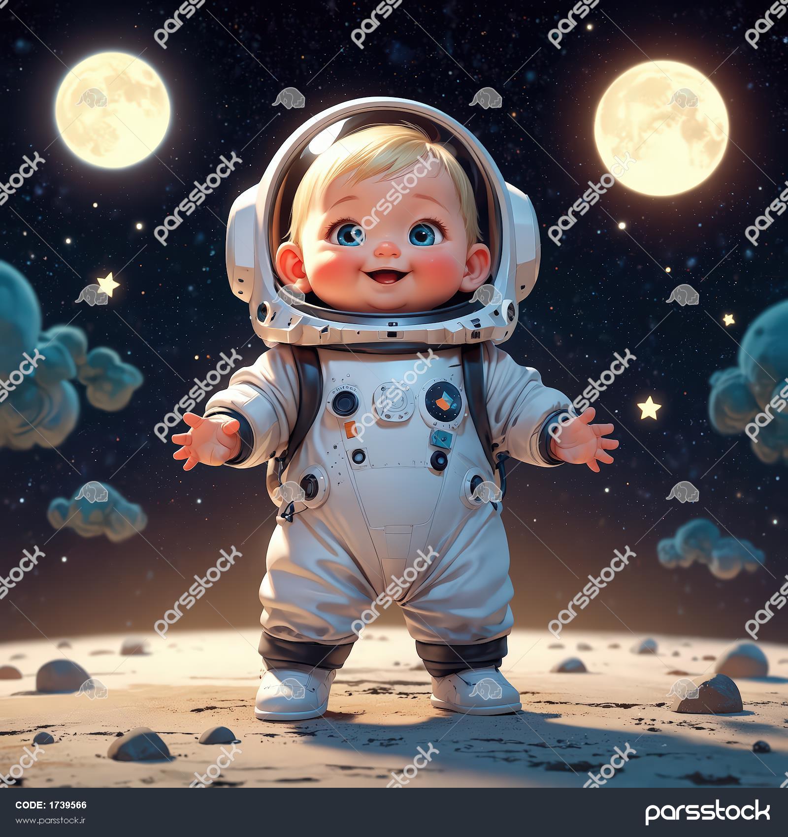 کودک فضانورد بلوند ایستاده بر سطح ماه با دو کره ماه بزرگ و ستارگان در زمینه شب