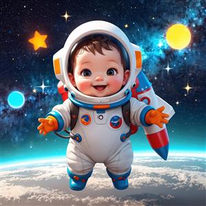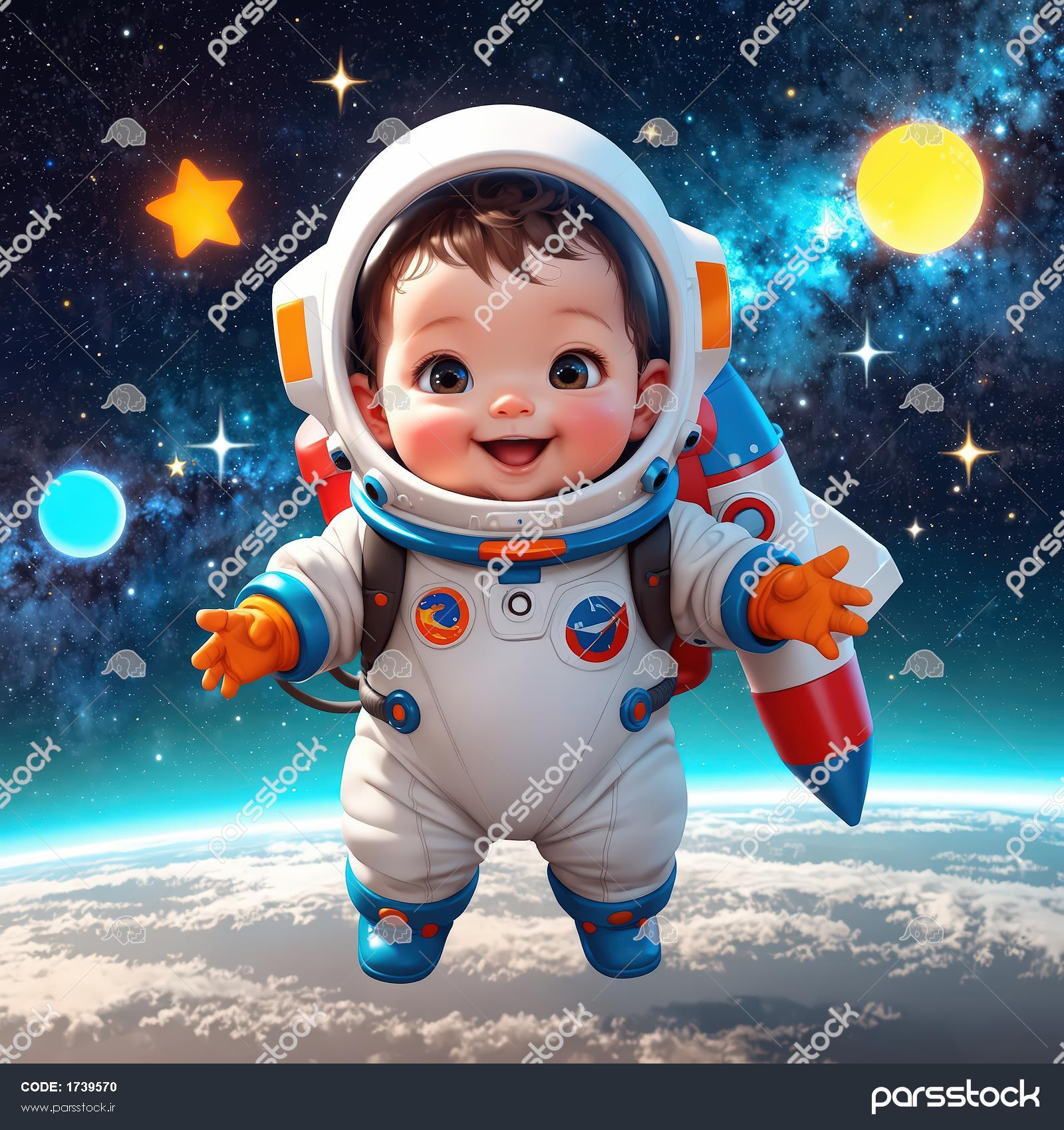 تصویر سه بعدی کودک فضانورد در فضا، بالای کره زمین با موشک پشتی و ستارگان رنگی