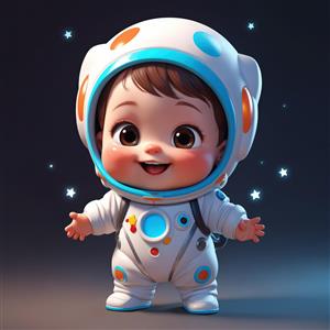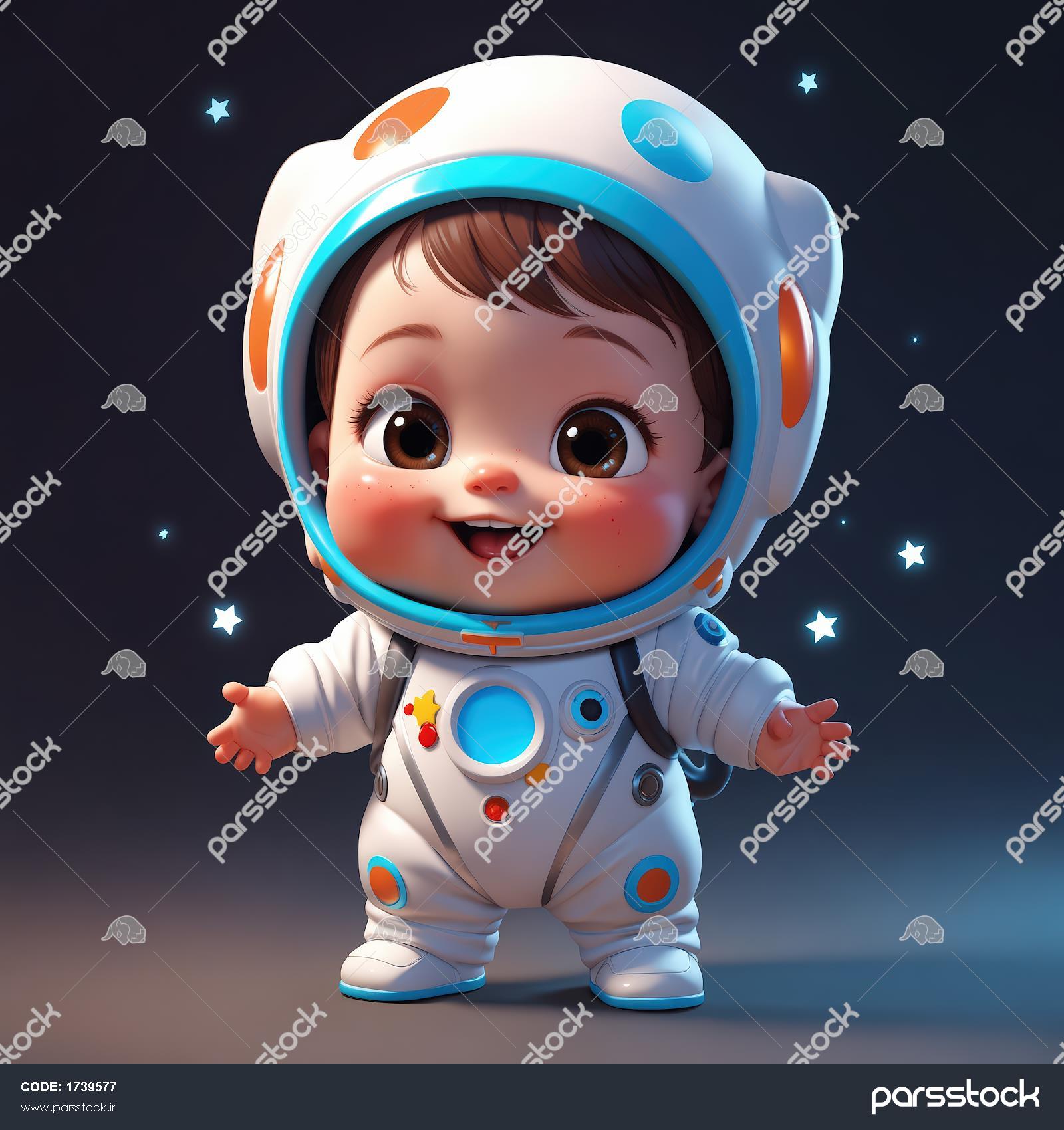 تصویر کودک فضانورد خندان با لباس سفید و کلاه با لبه آبی و خال‌های نارنجی و آبی