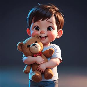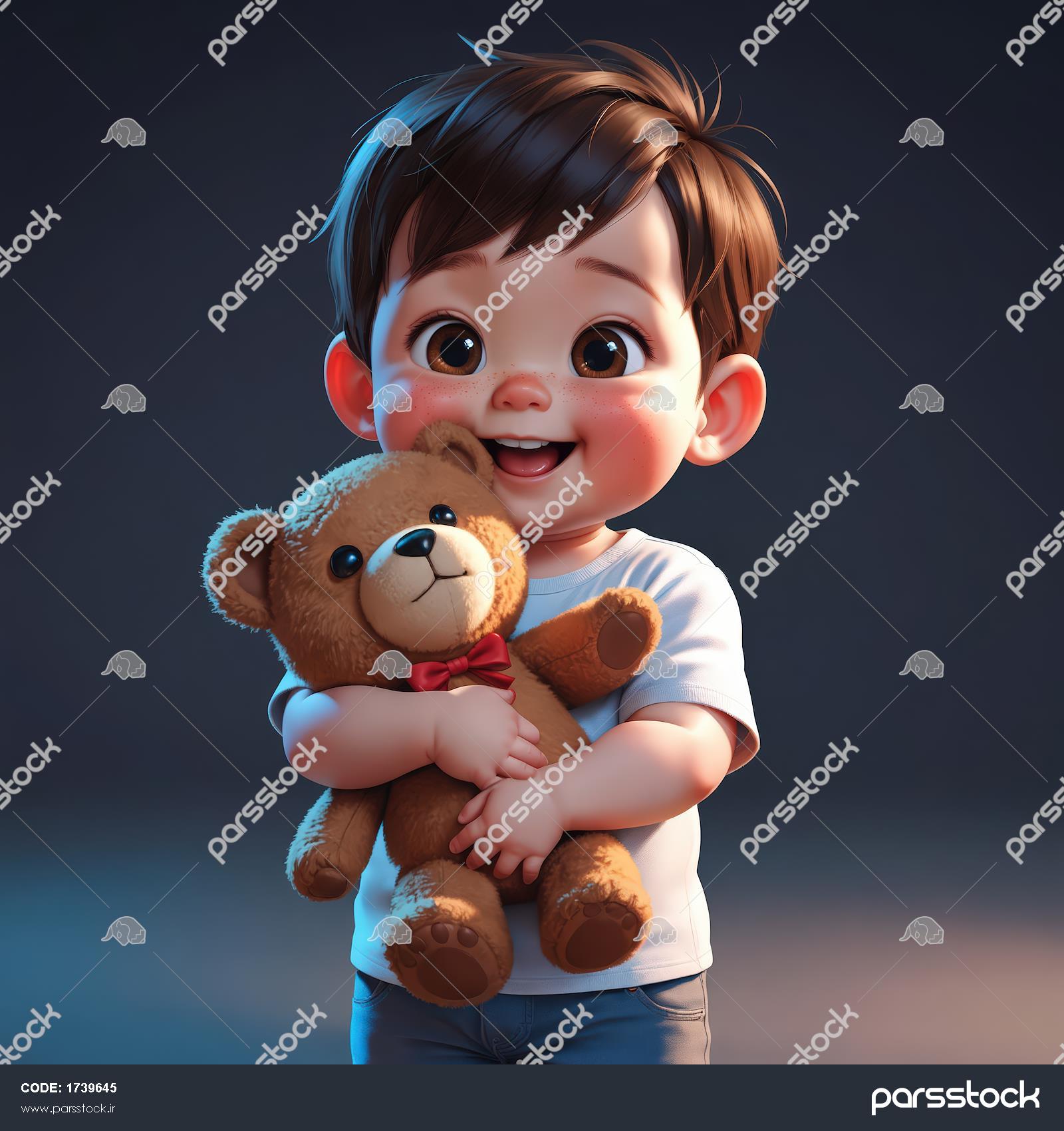 دانلود عکس استوک کاراکتر کودک خندان در حال بغل کردن خرس عروسکی (چاپ عریض)