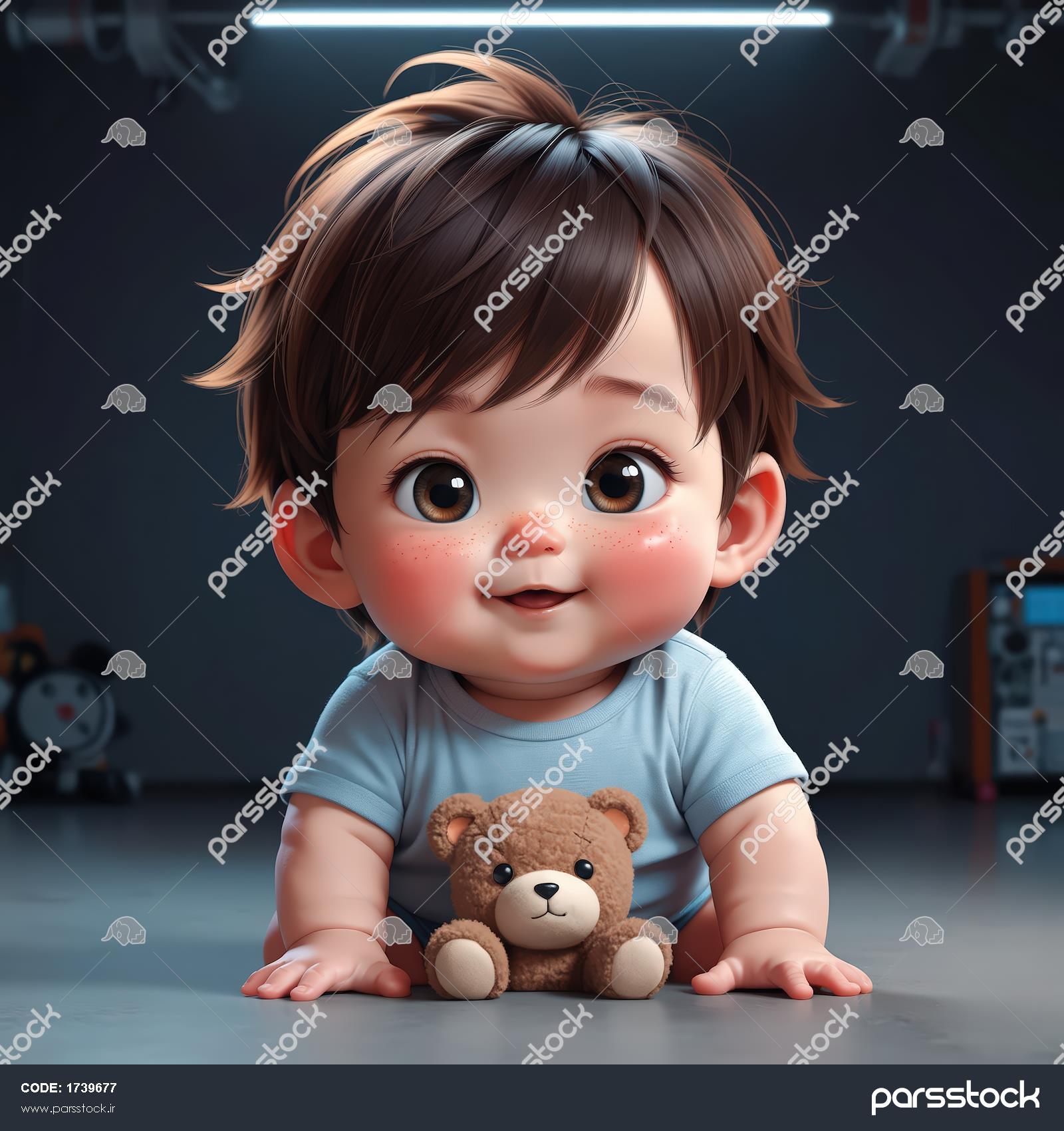 عکس باکیفیت بالا از نوزاد پسر کارتونی در حال چهاردست‌وپا رفتن، با خرس تدی کوچک، مناسب تابلو اتاق نوزاد