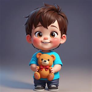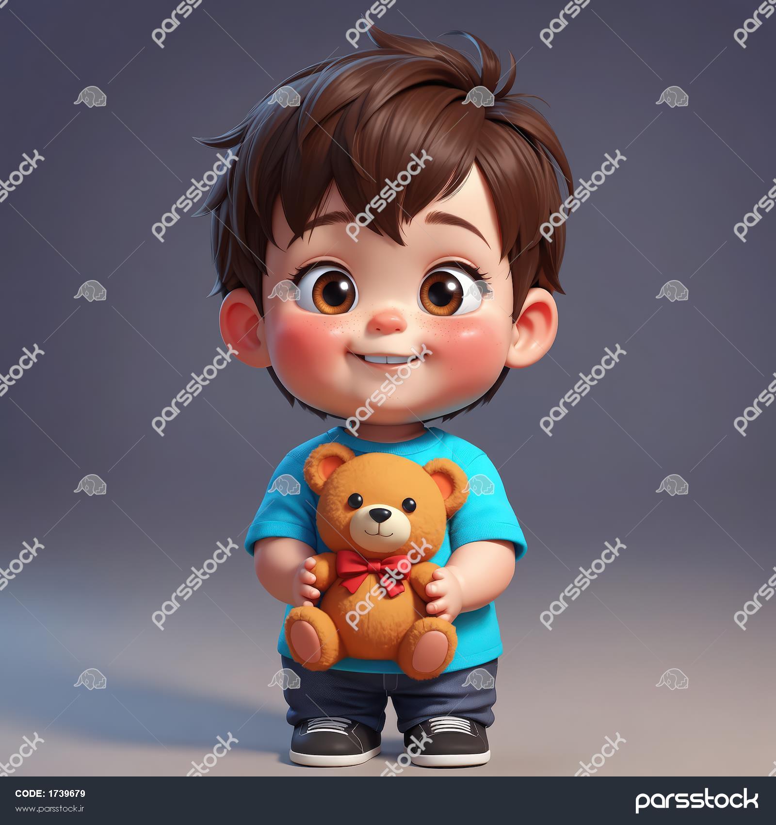 عکس استوک پسرک کارتونی خندان با خرس عروسکی پاپیون دار، با زمینه تیره، ایده آل برای چاپ تابلو مدرن